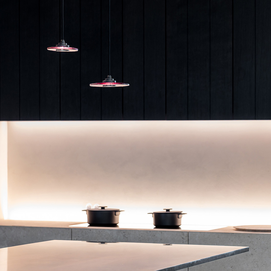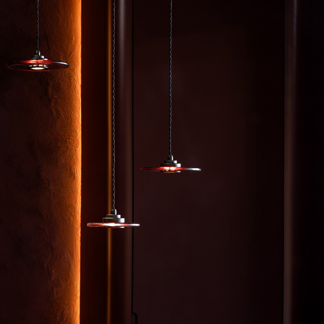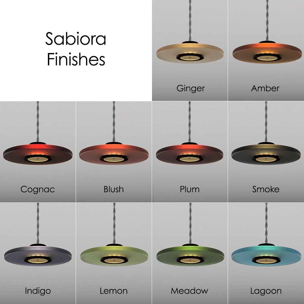 Choose from a plethora of glass finishes to create the perfect match for diverse interiors: ginger, amber, cognac, blush, plum, smoke, indigo, lemon, meadow, or lagoon. Sabiora is available in a medium Ø160mm disc for a more subtle accent piece, or a large Ø200mm disc for a statement feature in the home. Combine the various sizes to create a harmonious focal point or install a row of the modern drop lights above a kitchen island.