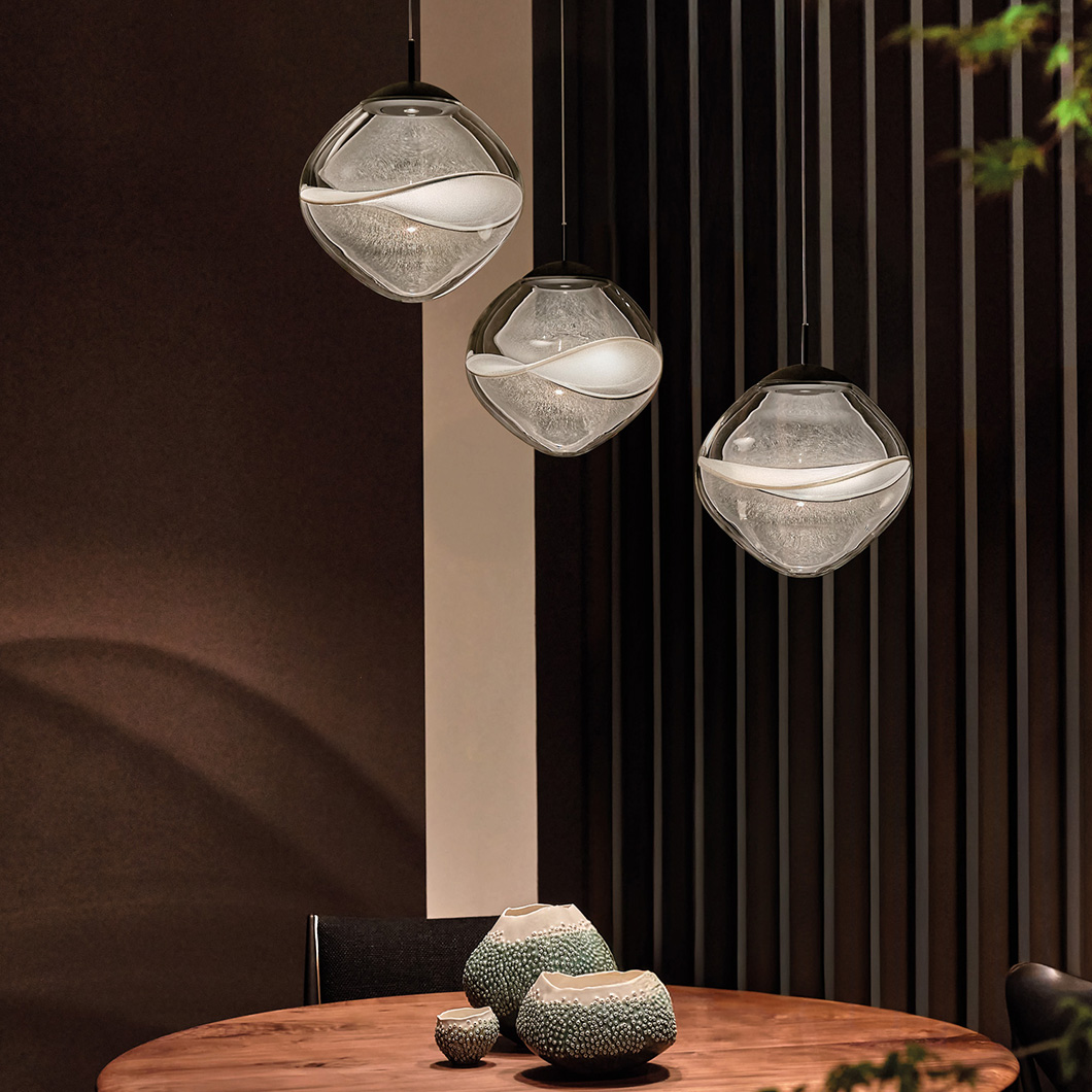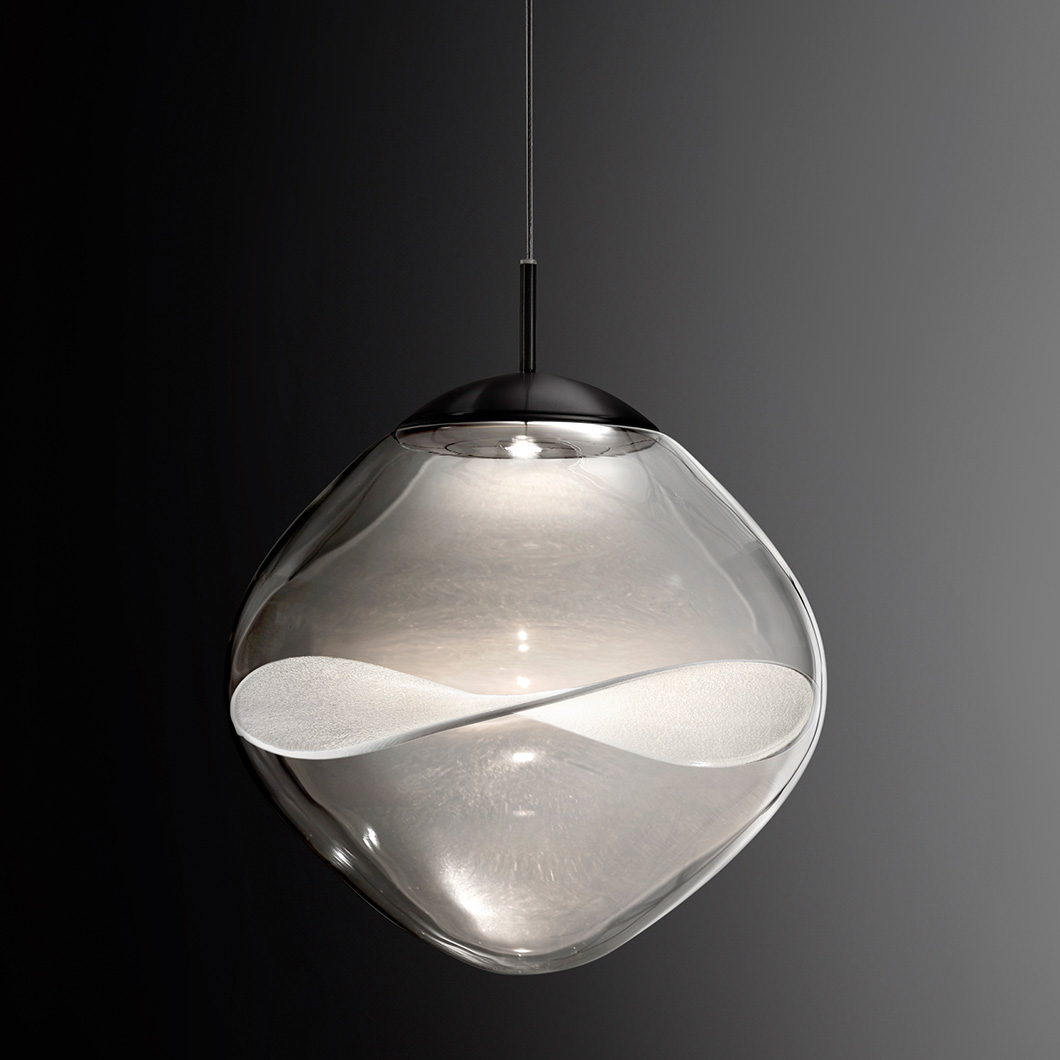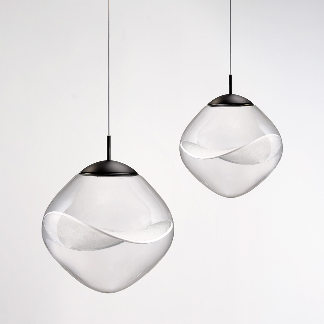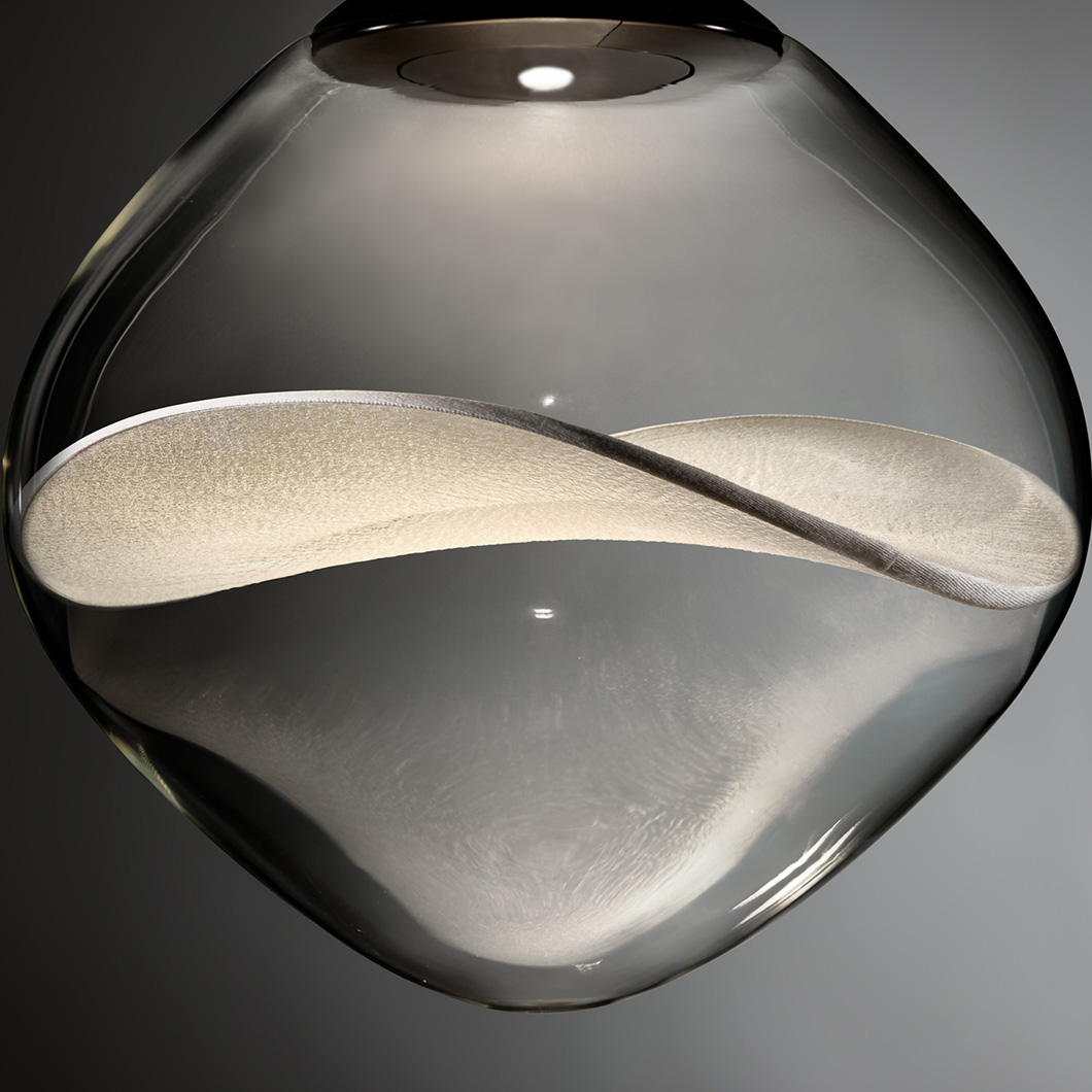 The Aether LED Pendant by Lumina exhibits pure, minimalist elegance with unique decorative details. Crafted from transparent borosilicate glass, the rounded diffuser houses a delicate Japanese organza petal, offering a level of transparency and light reflection that enhances the natural texture of the fabric and creates a soft interplay of light and shadow. The contemporary suspension light fuses innovative design, technology, and craftsmanship to provide an ambient, stunning luminaire.