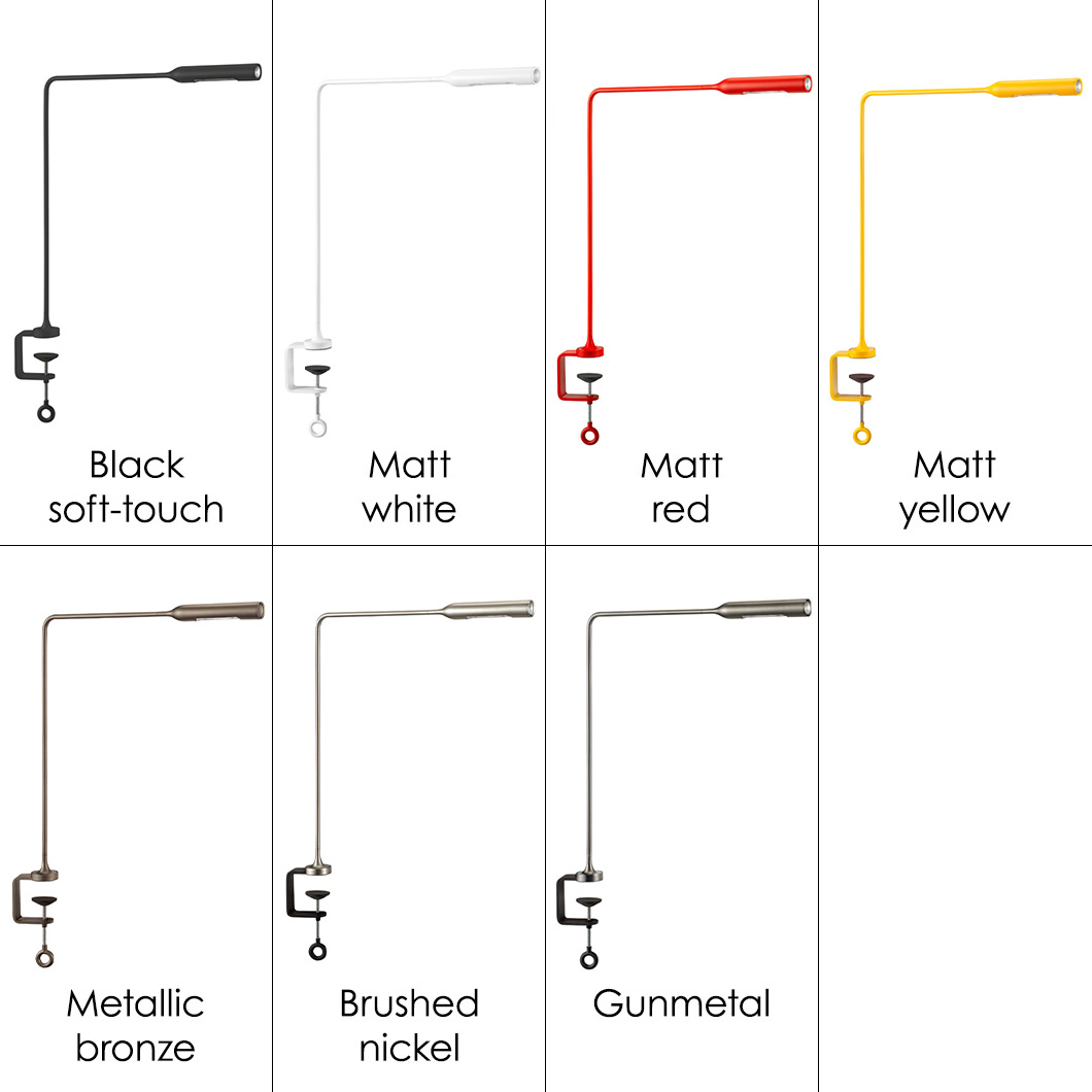 Available in black soft-touch, matt white, matt red, matt yellow, metallic bronze, gunmetal, and brushed nickel. The minimalist and timeless Lumina Flo is perfect as a flexible desk lamp that can be easily moved, with a 6W integrated LED and a sleek two-step switch in the head - one click for full brightness and two clicks for 50% intensity.