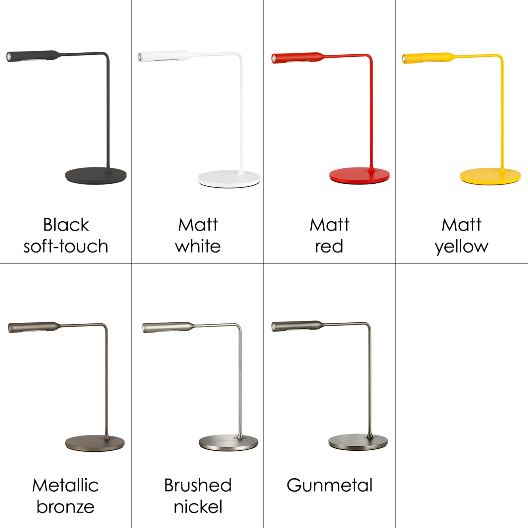 Available in black soft touch, matt white, matt red, matt yellow, metallic bronze, gunmetal and brushed nickel. The minimalist and timeless Lumina Flo is perfect as a bedside night light or reading lamp, with a 3W integrated LED and a sleek two step switch in the head - one click for full brightness and two clicks for 50% intensity. The Flo LED Bedside Lamp is slightly shorter than the Flo Desk version, with a lower power LED.