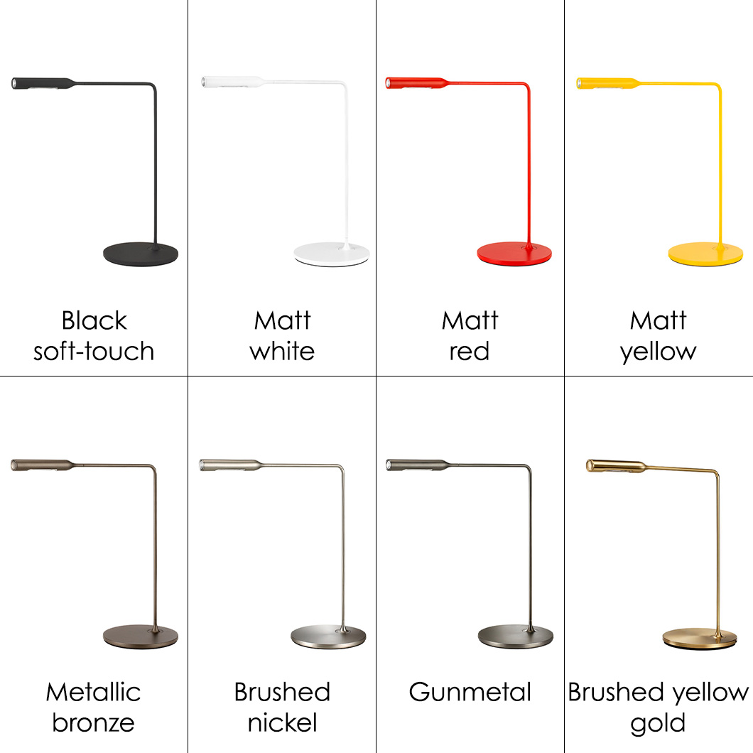 Available in black soft touch, matt white, matt red, matt yellow, metallic bronze, brushed nickel, gunmetal and brushed yellow gold. The minimalist and timeless Lumina Flo is powerful enough to serve as a desk lamp in a home office, with a 6W integrated LED and a sleek two step switch in the head - one click for full brightness and two clicks for 50% intensity. The Flo LED Desk Lamp is slightly taller than the Flo Bedside version, with a higher power LED.