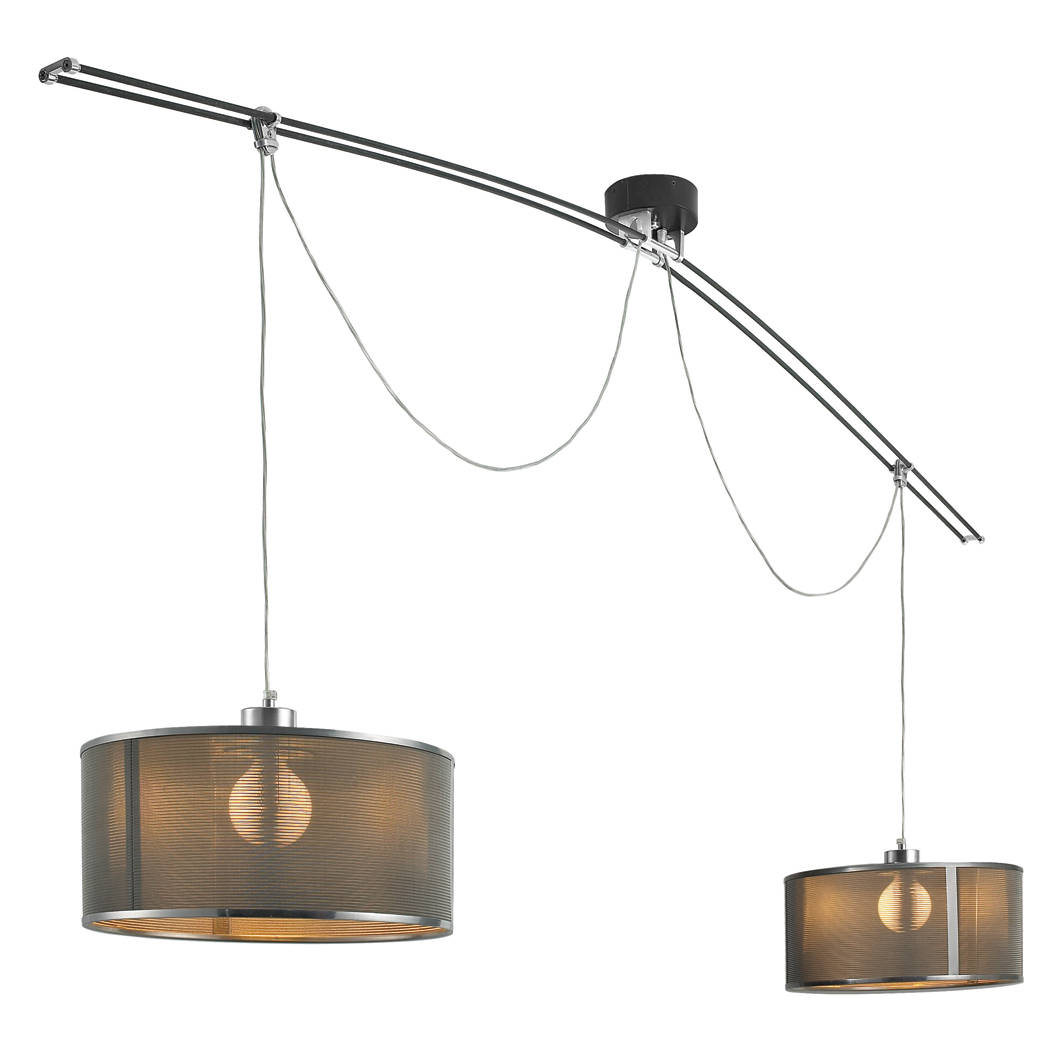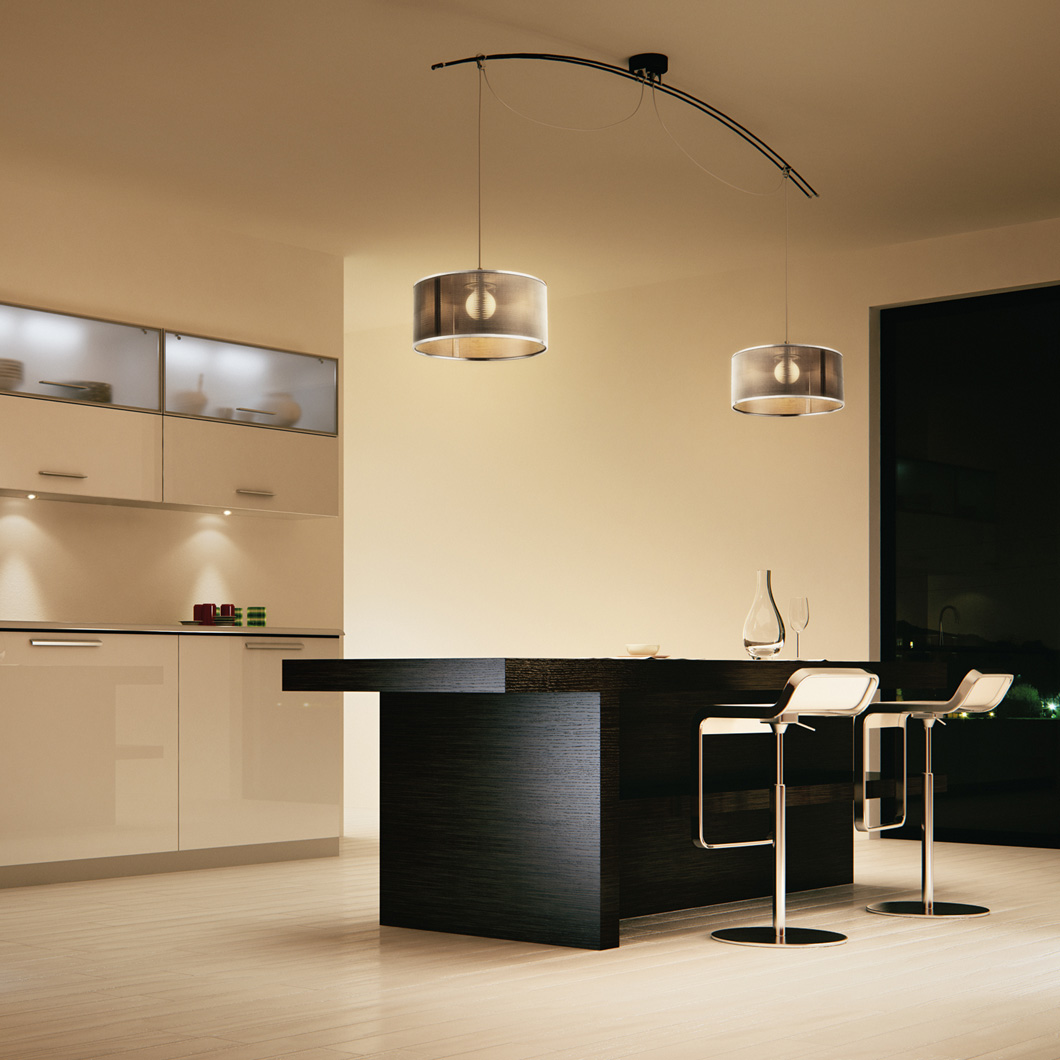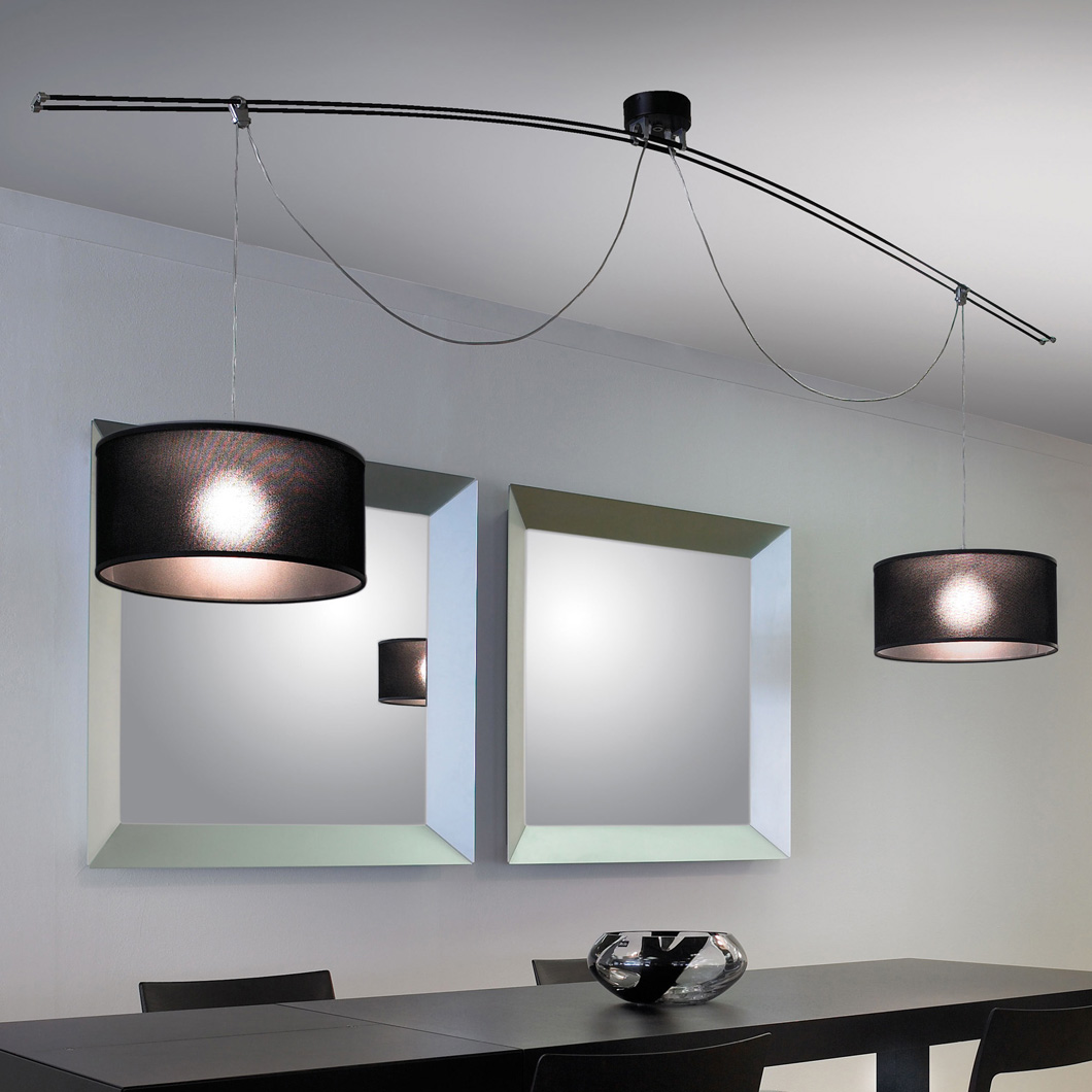 The Lumina Moove Doppia Pendant is a contemporary twin suspension light fitting that combines modern styling with practical functionality. Ideal for installation over a kitchen table or where the position of the light needs to be regularly changed, the carbon fibre support arms rotates 180° whilst the height of each individual lamp shade can be easily adjusted using the pulley. The drum shades are available in black, grey or ivory fabric, and in woven polished aluminium. Lamps not included.