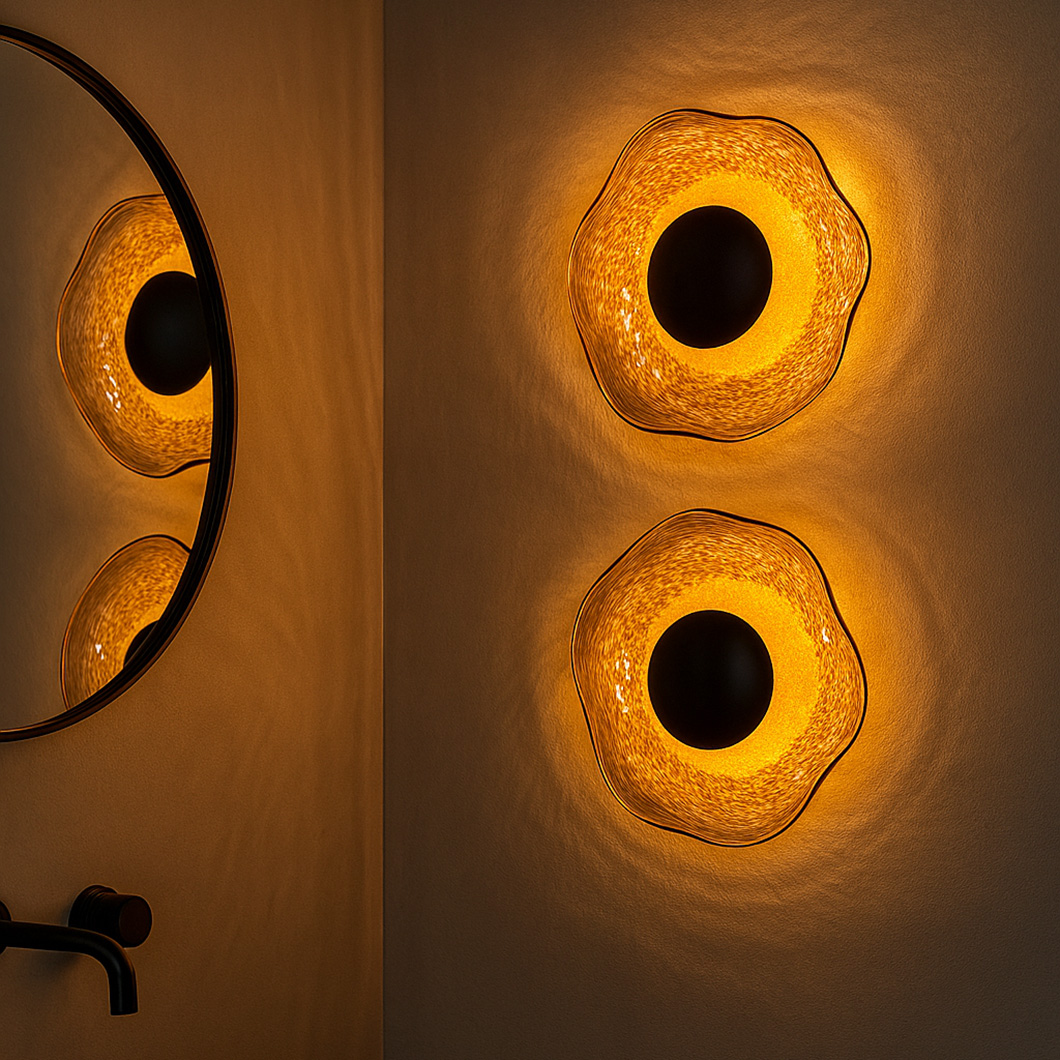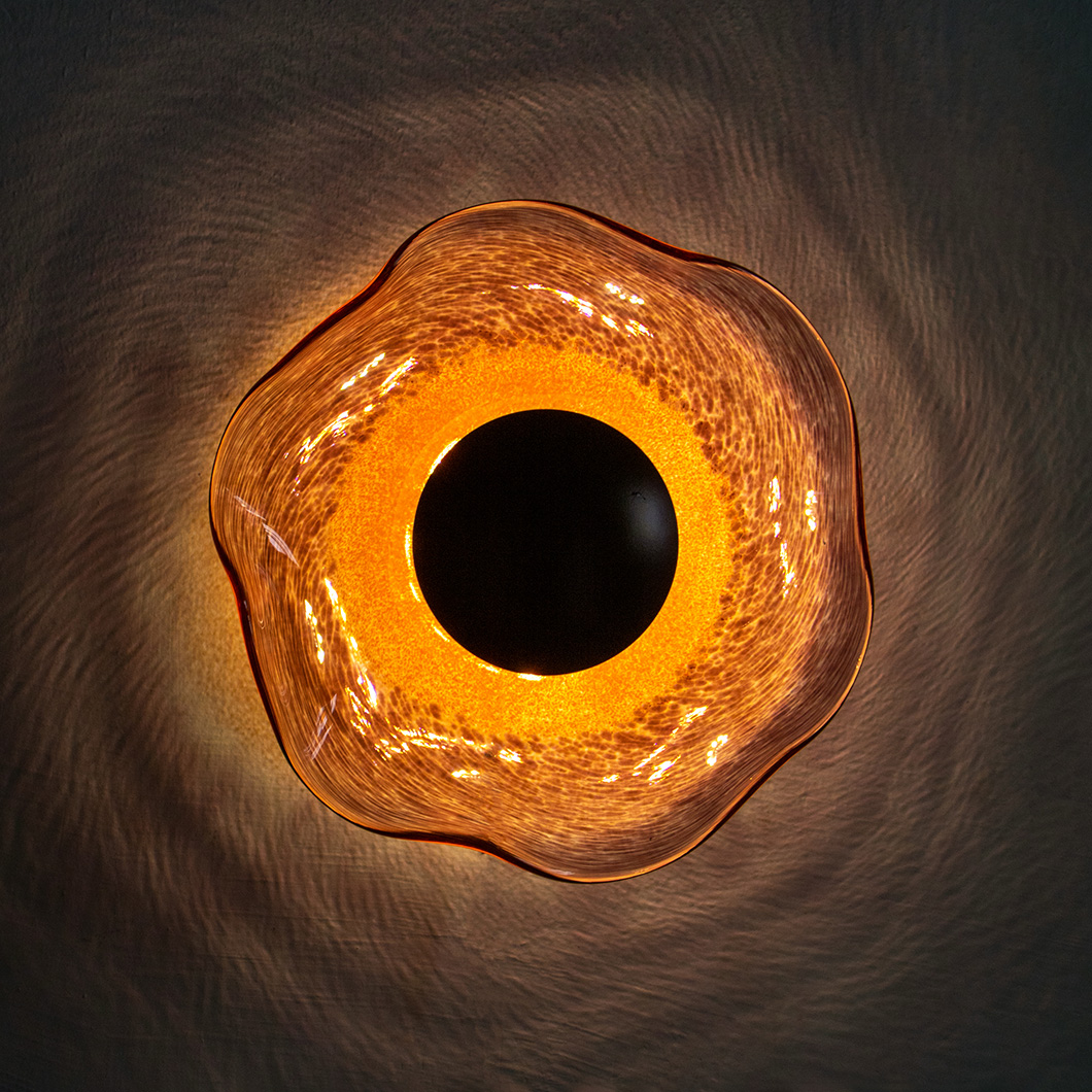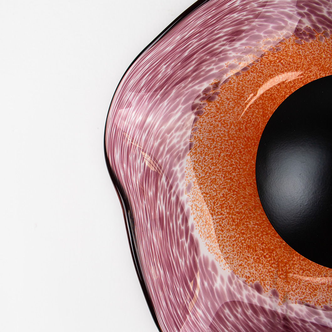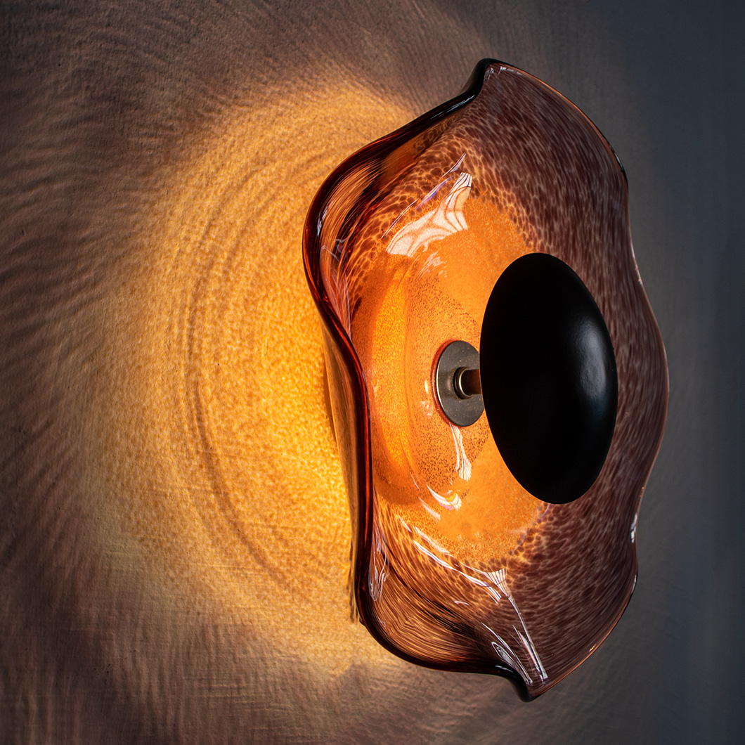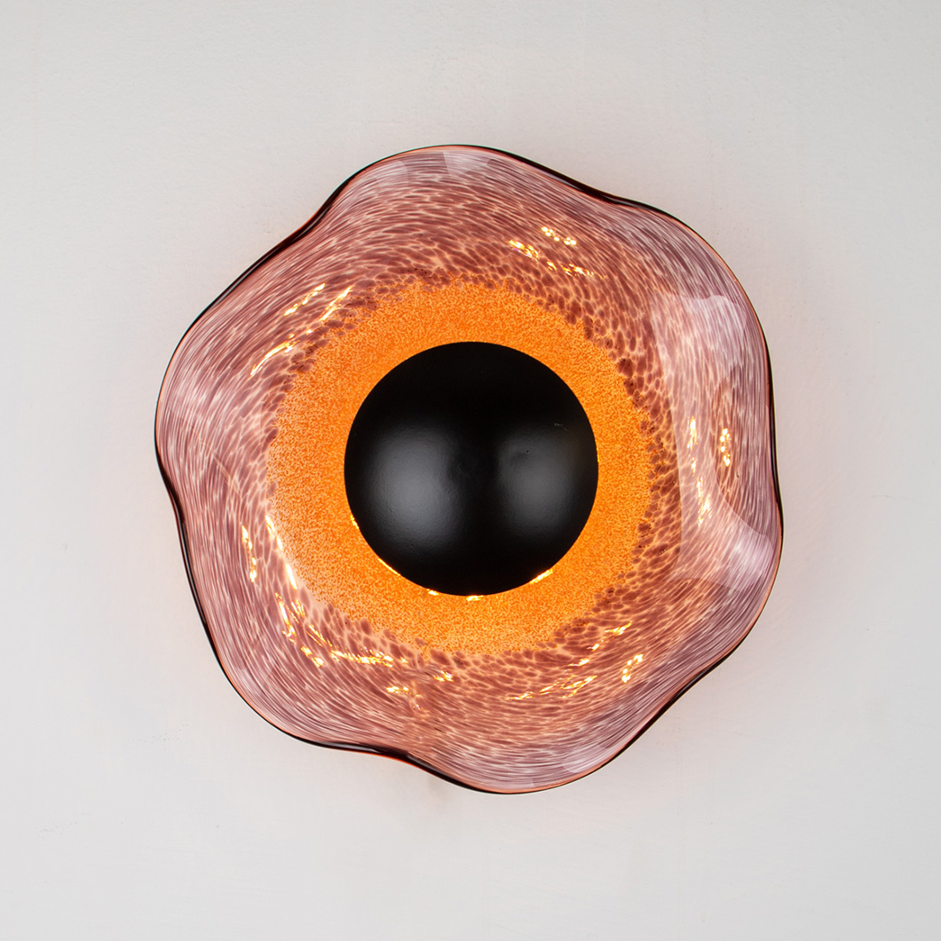 Nova features a hand-blown glass disc with a multi-coloured textured pattern that reflects the cosmic burst of light. The centre of the luminaire holds a round metal core that is available in black, white, chrome, antique brass, or yellow. Place Nova in a lavish hallway as a decorative feature with ambient lighting, or install the celestial fitting in a contemporary bedroom to add a soft, diffused glow.