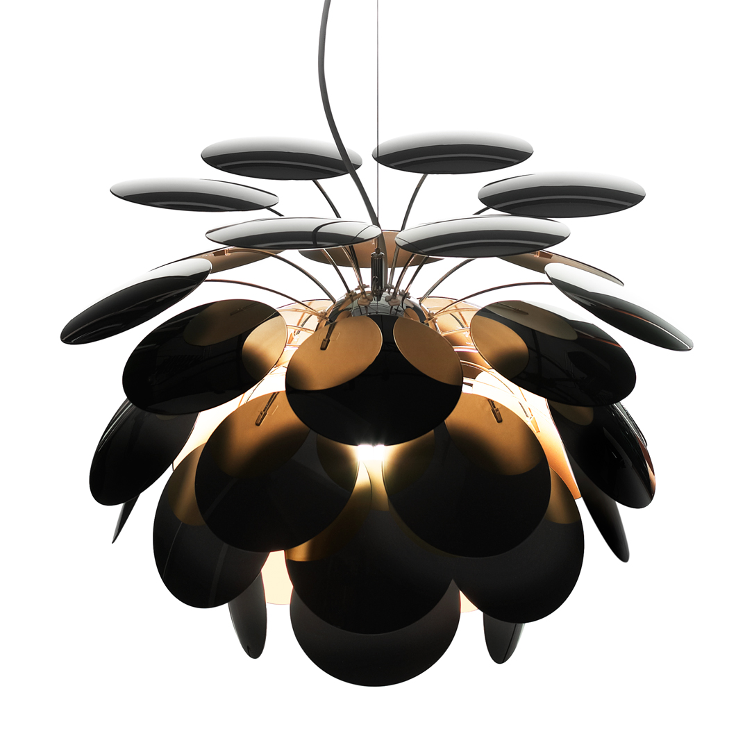 The Marset Discoco Extra Large Pendant is constructed out of 35 opaque moulded ABS discs. As the name suggests, it’s a very disco themed lamp with the light reflecting off both sides off the slanted chromed discs which sprout outwards like a hanging plant. The lamp looks stylish, whether turned on or off. Available in white, grey, beige and black & gold. 5 sizes available (see related products below for the rest). Lamps not included.