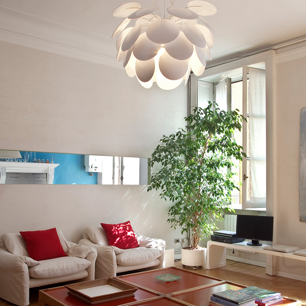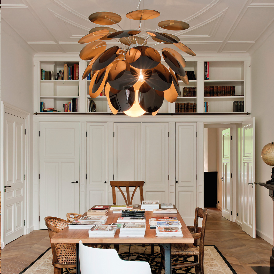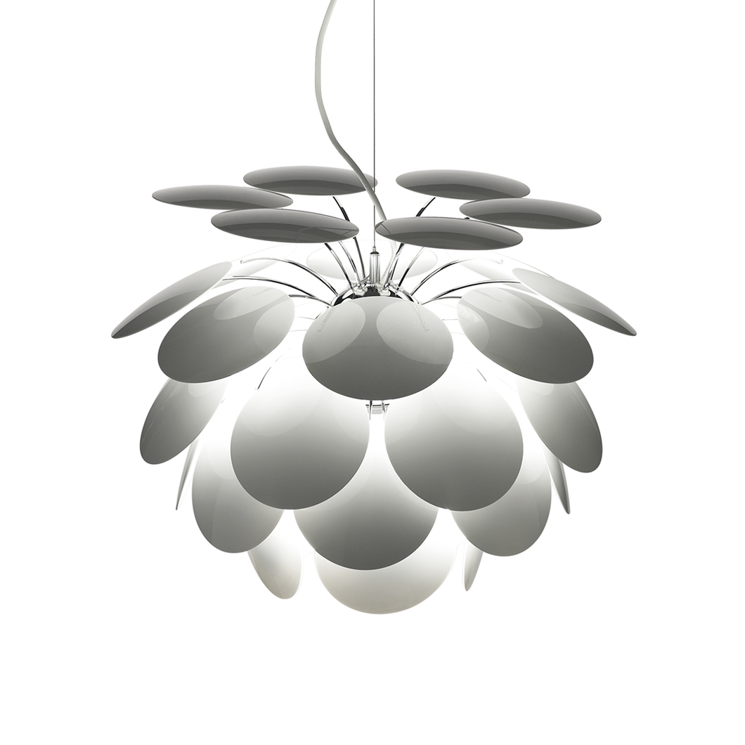 The Marset Discoco Large Pendant is constructed out of 35 opaque moulded ABS discs. As the name suggests, it’s a very disco themed lamp with the light reflecting off both sides off the slanted chromed discs which sprout outwards like a hanging plant. The lamp looks stylish, whether turned on or off. Available in white, grey, beige and black & gold. 5 sizes available (see related products below for the rest). Lamps not included.