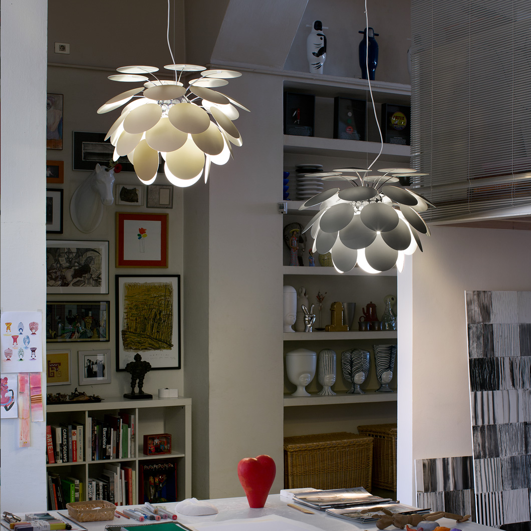 The Marset Discoco Medium Pendant is constructed out of 35 opaque moulded ABS discs. As the name suggests, it’s a very disco themed lamp with the light reflecting off both sides off the slanted chromed discs which sprout outwards like a hanging plant. The lamp looks stylish, whether turned on or off. Available in white, grey, beige and black & gold. 5 sizes available (see related products below for the rest). Lamps not included.