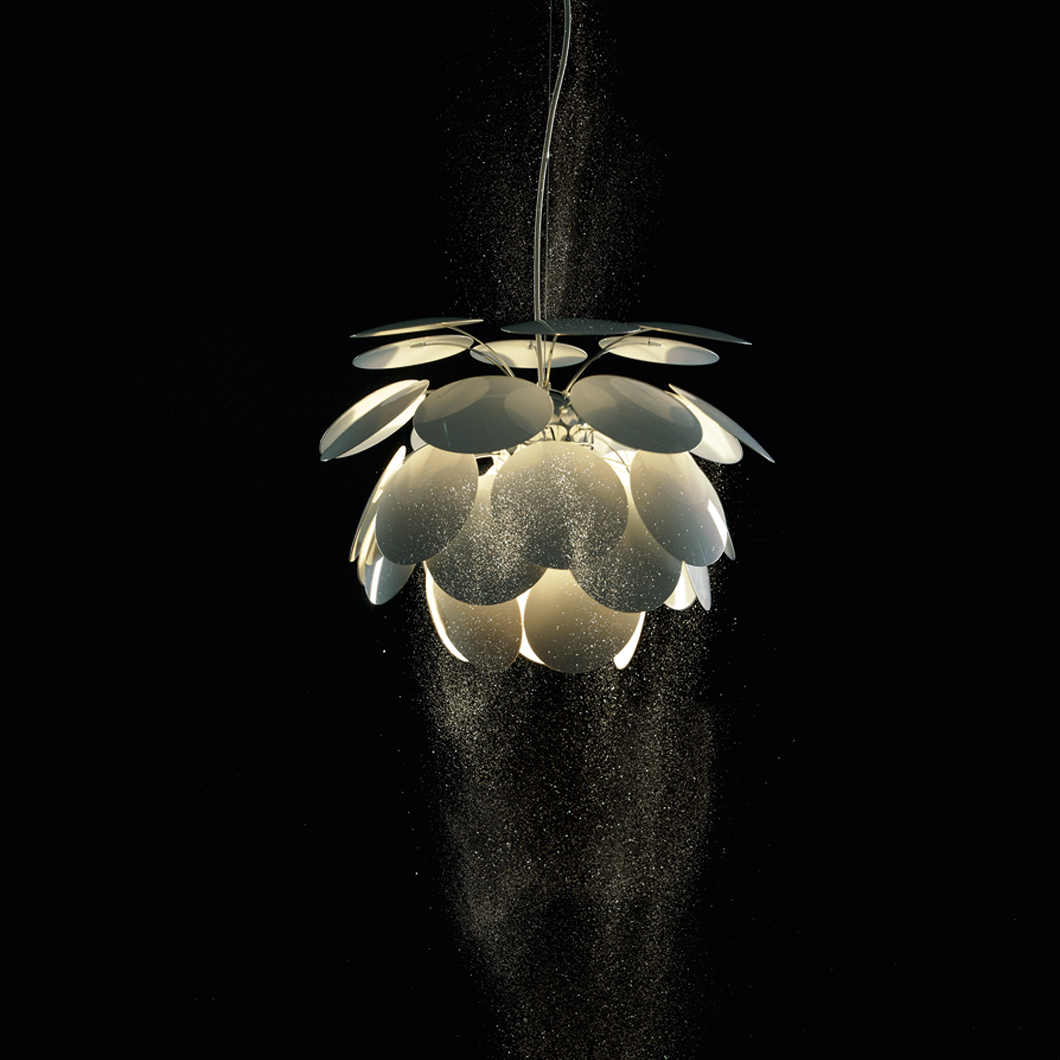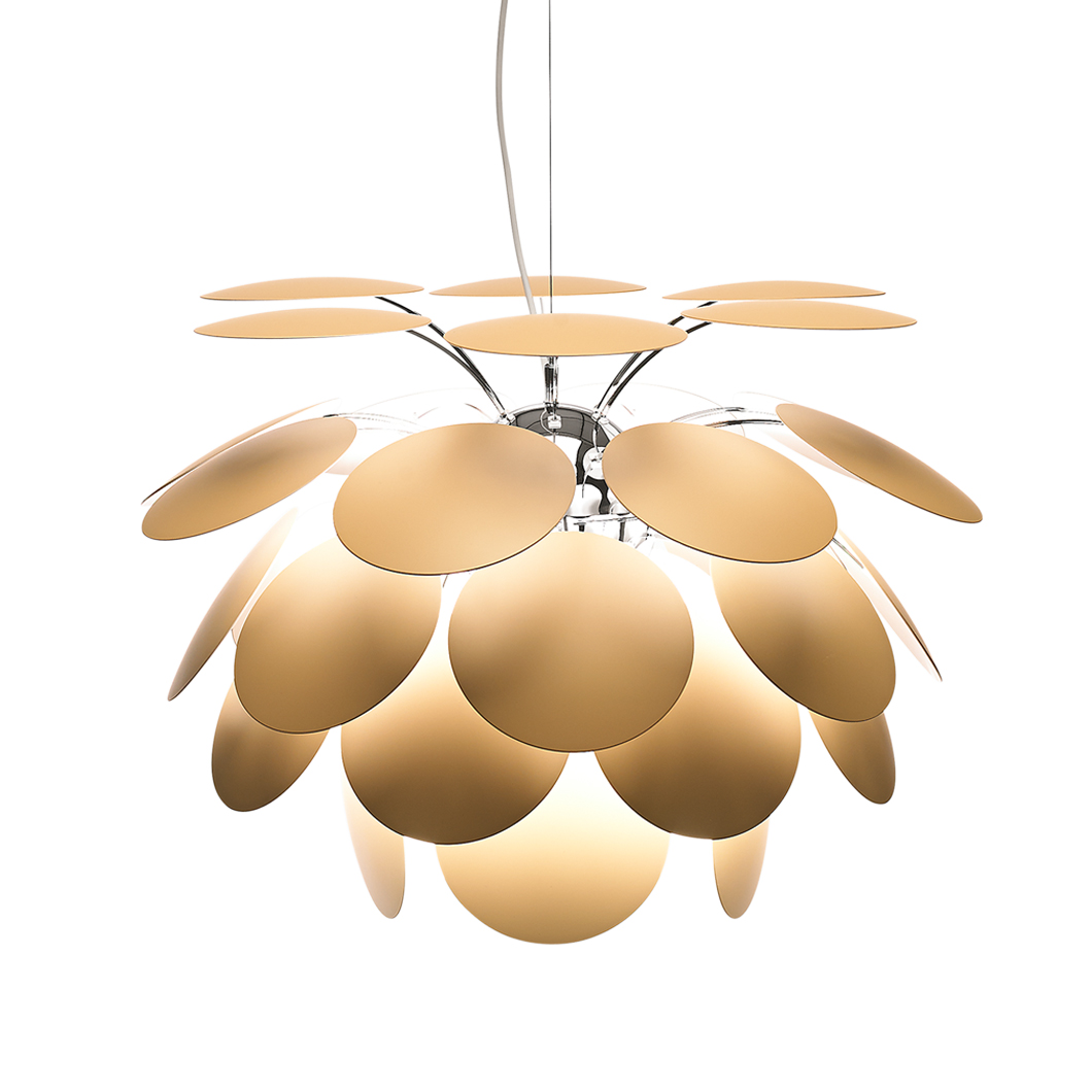 The Marset Discoco Small Pendant is constructed out of 35 opaque moulded ABS discs. As the name suggests, it’s a very disco themed lamp with the light reflecting off both sides off the slanted chromed discs which sprout outwards like a hanging plant. The lamp looks stylish, whether turned on or off. Available in white, grey, beige and black & gold. 5 sizes available (see related products below for the rest). Lamps not included.