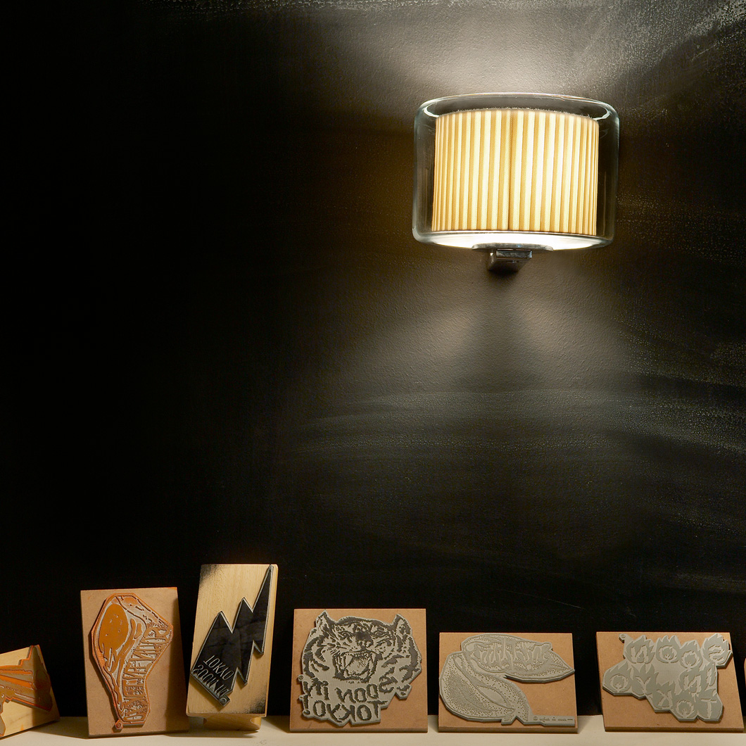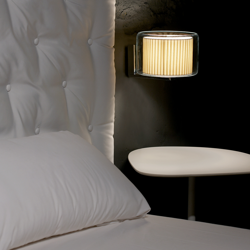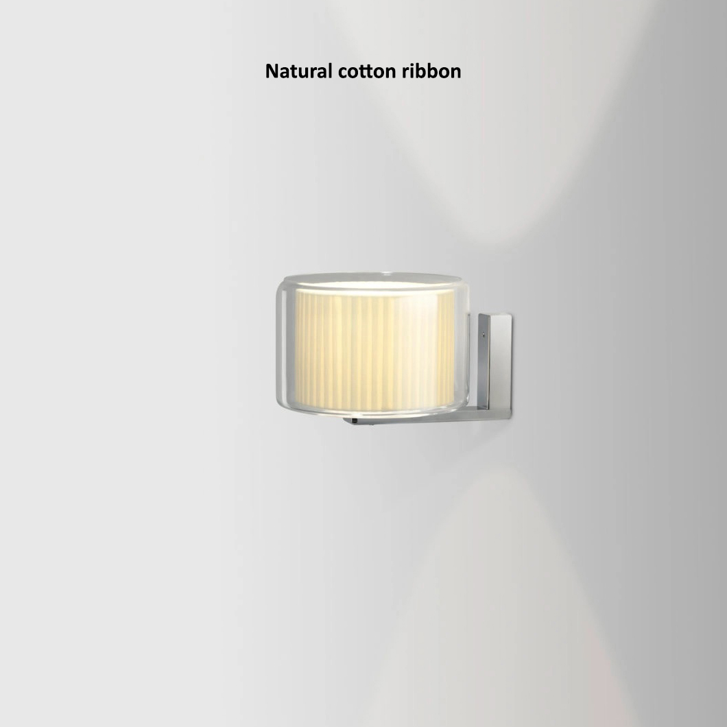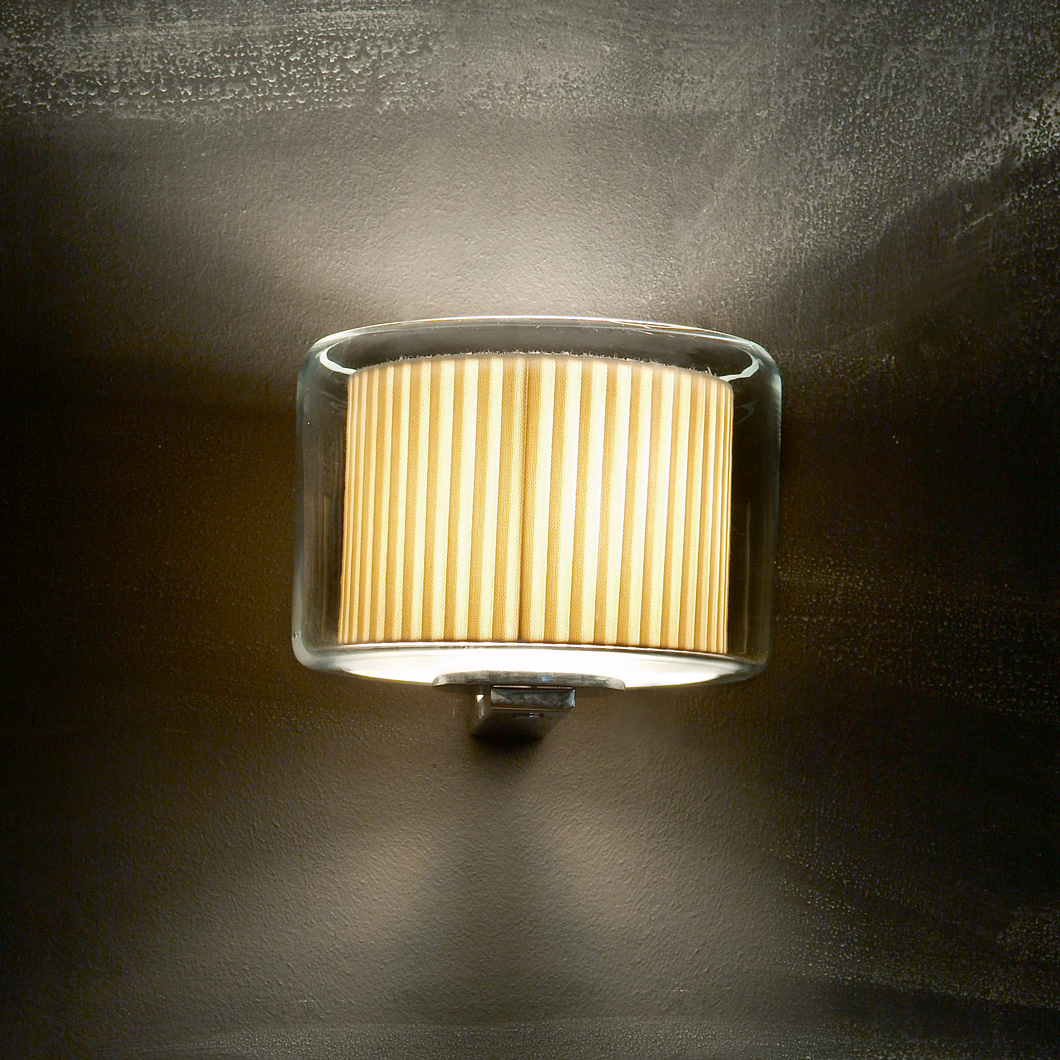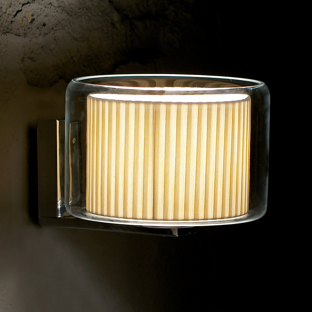 The Marset Mercer Wall Light is a delicate stylish lamp constructed by a textile shade which hovers inside a transparent blown glass structure. This contrast in materials makes Mercer look more eye-catching and unique. Inner diffuser is available in natural cotton ribbons for a traditional twist or pearl white for a more modern effect. Wall bracket in chromed iron. Lamps not included.