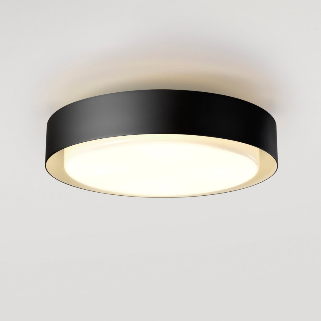 The Marset Plaff-On! Ceiling Light is constructed by a ring shaped lacquered aluminium shade. A very simplistic design. The diffuser allows the light to project upwards at the celling, creating an interesting halo lighting effect. Available in an alternative LED version (see related products). Black finish. The interior of the shade is white, resulting in the light emitted being reflected and almost creating a second halo. Lamps not included.