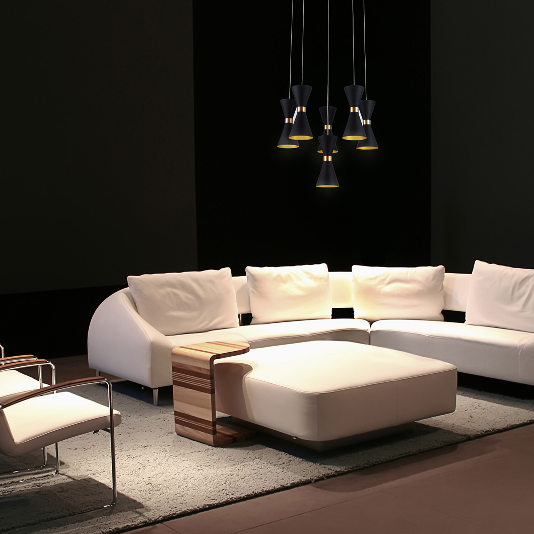Cornet is a family of hourglass-shaped luminaires easily distinguishable from their iconic black and gold coatings. The Cornet family is also available as both a singular pendant and a wall lamp. See below in More Like This for more information. LEDs included.