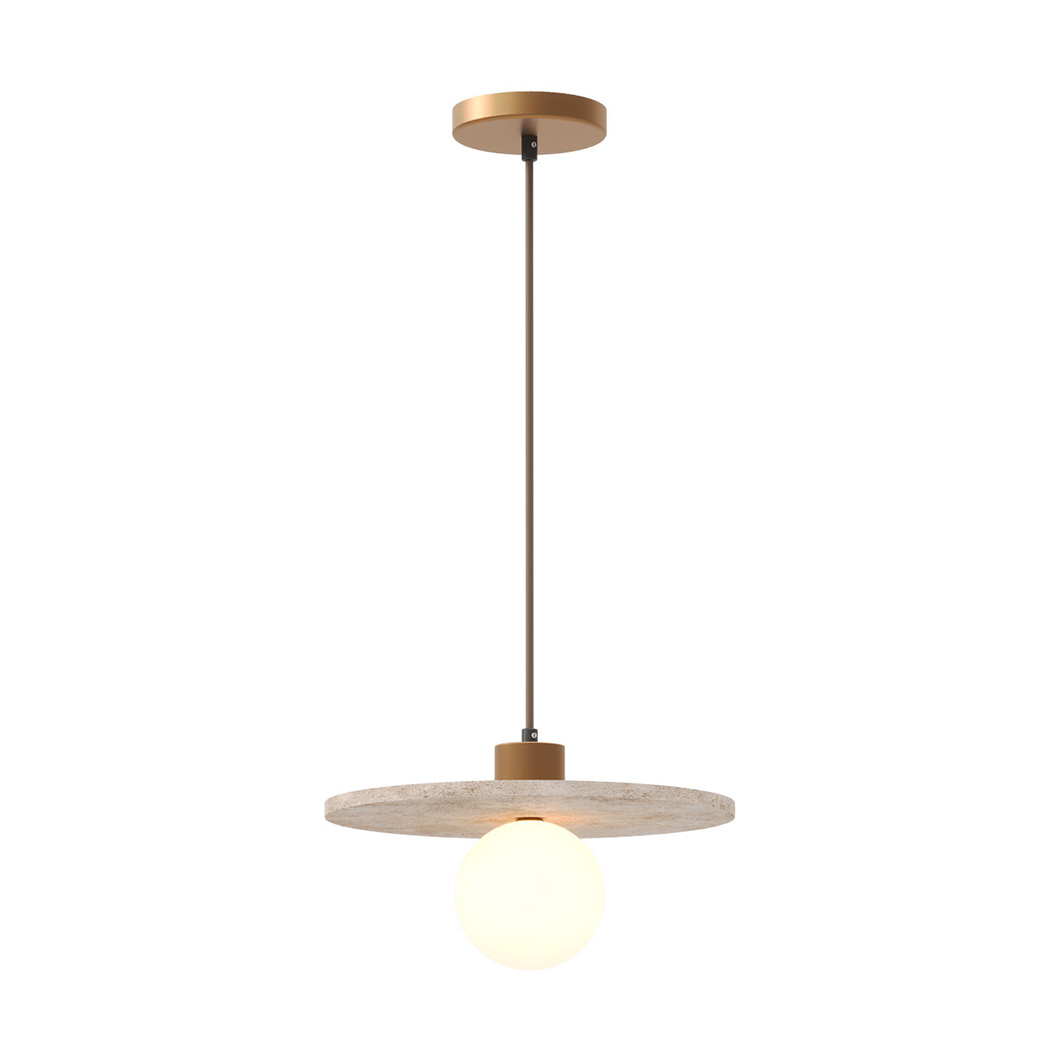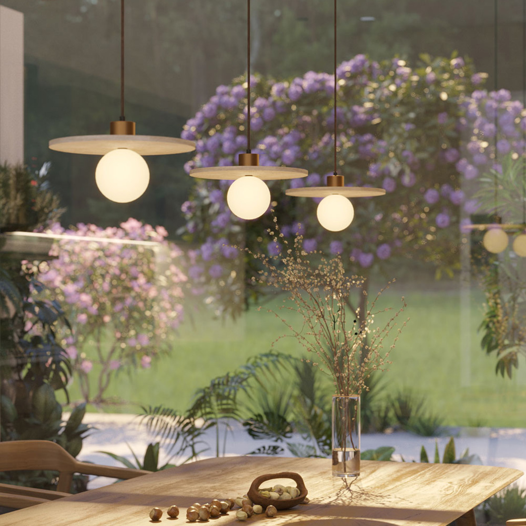 The Lando Pendant is a chic addition to a modern home, ideally installed as a row of three above a dining table, or over a kitchen island. The stylish suspension light has a circular base crafted from travertine stone with timeless brass details and a globe diffuser to house its light source. Lando has a diameter of 250mm, making it suitable for independent installation or as a group.