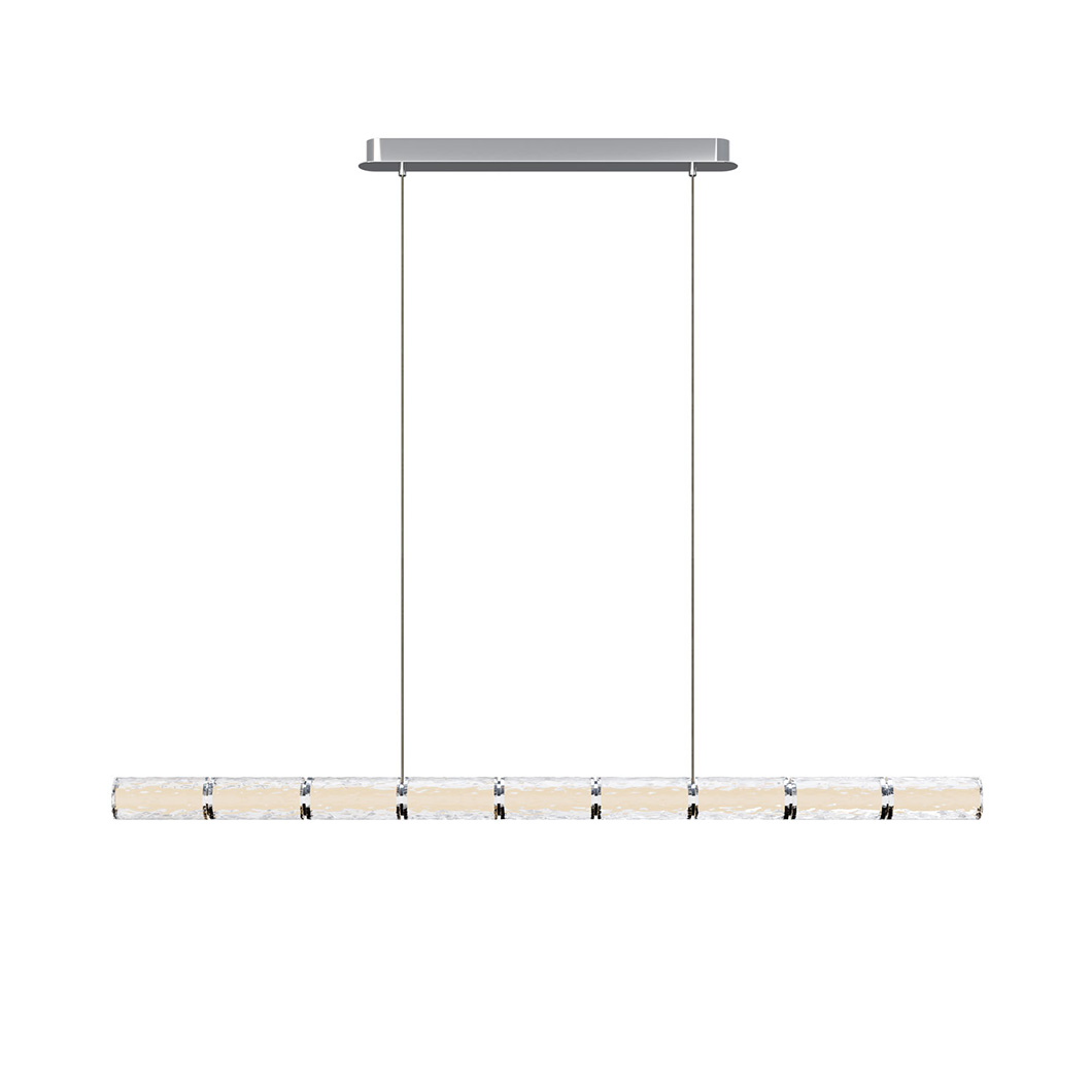 Love flaunts a modern look with its elongated linear structure. The cylindrical diffuser is crafted from acrylic, emitting a soft, warm 3000K glow. The suspension light is finished in a chrome coating to elevate its contemporary aesthetic and complement a range of home interiors. Place Love above a dining table or kitchen island for a stylish yet minimalist statement.