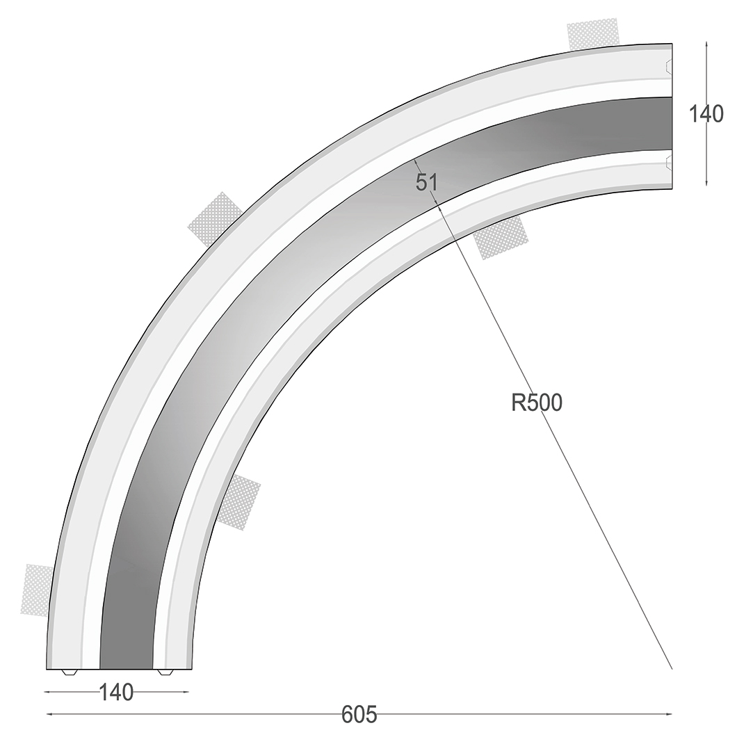 The Nama Athina 09 Curve R500 Out Plaster In Profile is the largest of Nama's modular quarter-circle curves, with a 50cm radius and the light source on the outside edge. The modular nature of Athina is perfect for creating bespoke linear LED lighting schemes that are almost limitless. The fitting is made from natural hard wearing plaster with the profile in aluminium to act as a heat sink for the LED strip. Plastered-in to integrate seamlessly with the architectural design, Athina is suitable for wall or ceiling installation. A soft and gentle light effect is achieved with the included polycarbonate diffuser.