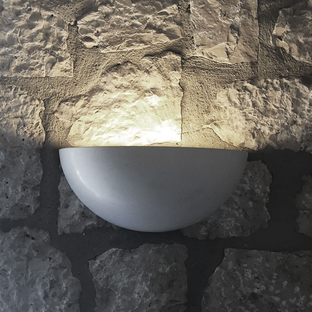 With a minimal bowl design, the Sfera 01 Wall Lamp by Nama produces an atmospheric up light which enhances the mood of a room. Made from a hard wearing plaster, the Sfera wall light can be decorated to match the interior scheme or left in its natural state. The soft curves and innate quality of the material make the Sfera bowl wall scone perfect for softening a hallway, or either side of a sofa in a living room or flanking a kingsize bed in a bedroom.