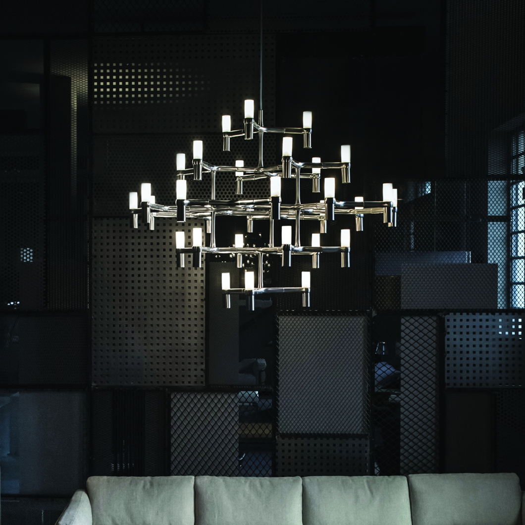 The Nemo Crown Major pendant has a modular structure in die-casted aluminium and sandblasted glass diffusers. Structure in aluminium hand polished, glossy gold plated or painted in matt white, matt black or gold. Widespread light. Transparent cable. Red cable on request.