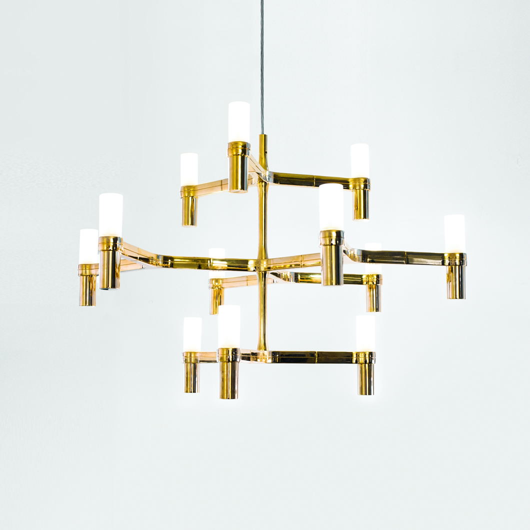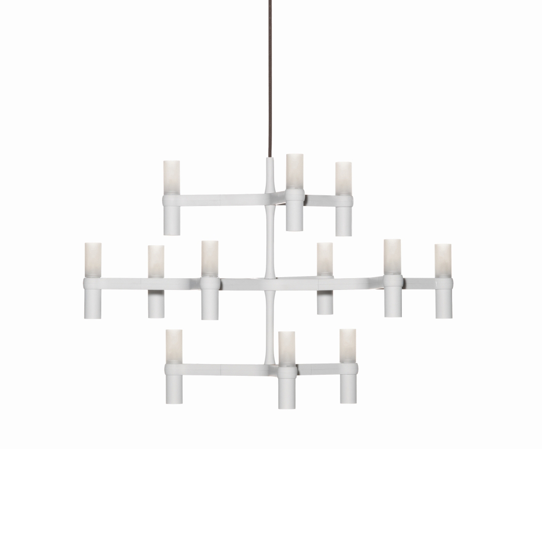 The Nemo Crown Minor pendant has a modular structure in die-casted aluminium and sandblasted glass diffusers. Structure in aluminium hand polished, glossy gold plated or painted in matt white, matt black or gold. Widespread light. Transparent cable. Red cable on request.