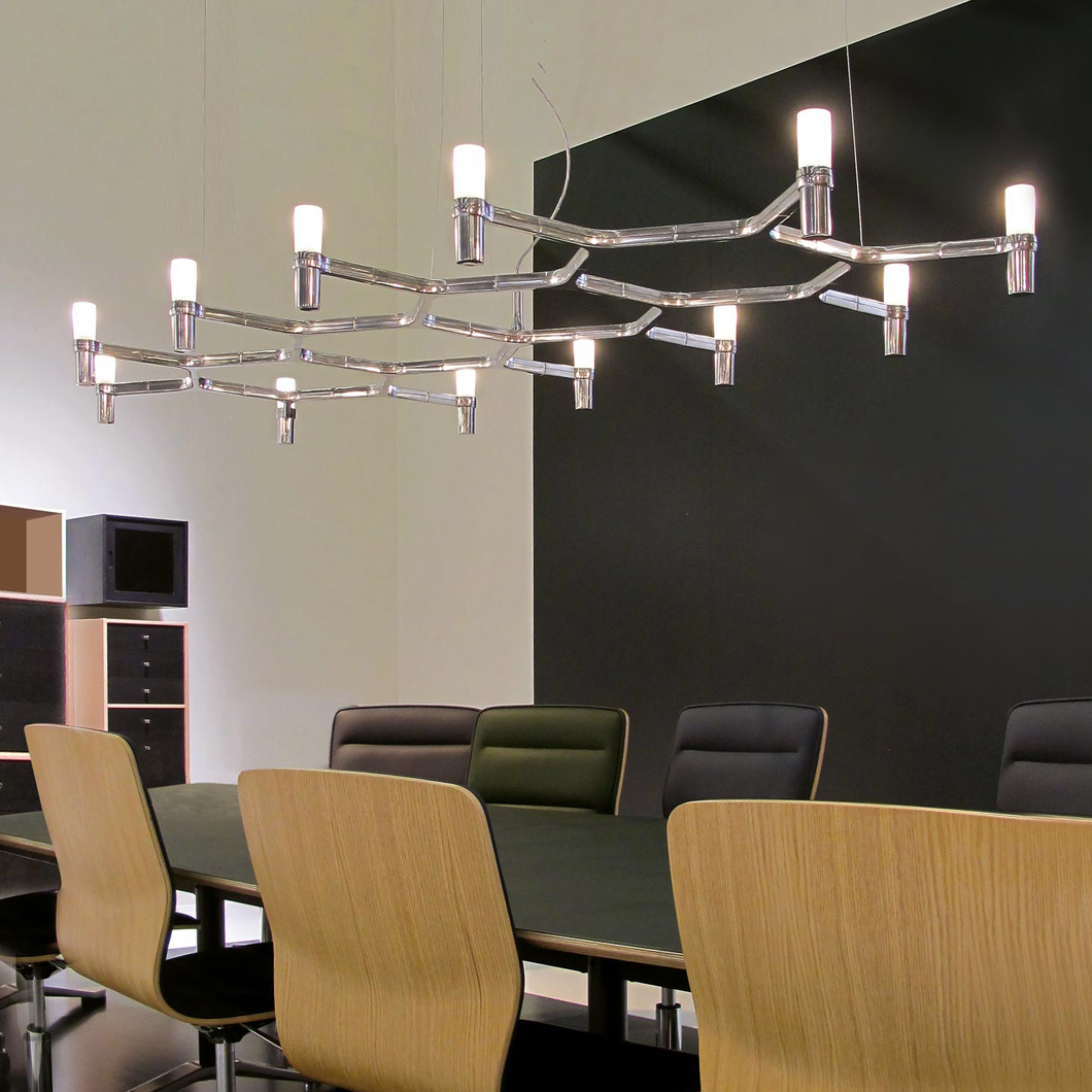 The Nemo Crown Plana Major pendant has a modular structure in die-casted aluminium and sandblasted glass diffusers. Structure in aluminium hand polished, glossy gold plated or painted in matt white, matt black or gold. Widespread light. Transparent cable. Red cable on request.