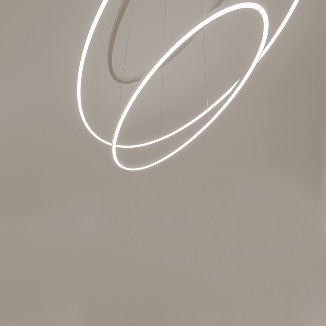 Ellisse Triple pendant impresses with its multiple circle structure, crafted from aluminium. This pendant comes complete with an opal diffuser. Manufactured using specialist extrusion technology, this lamp is available in either an elegant painted black or gold polished anodised finish.