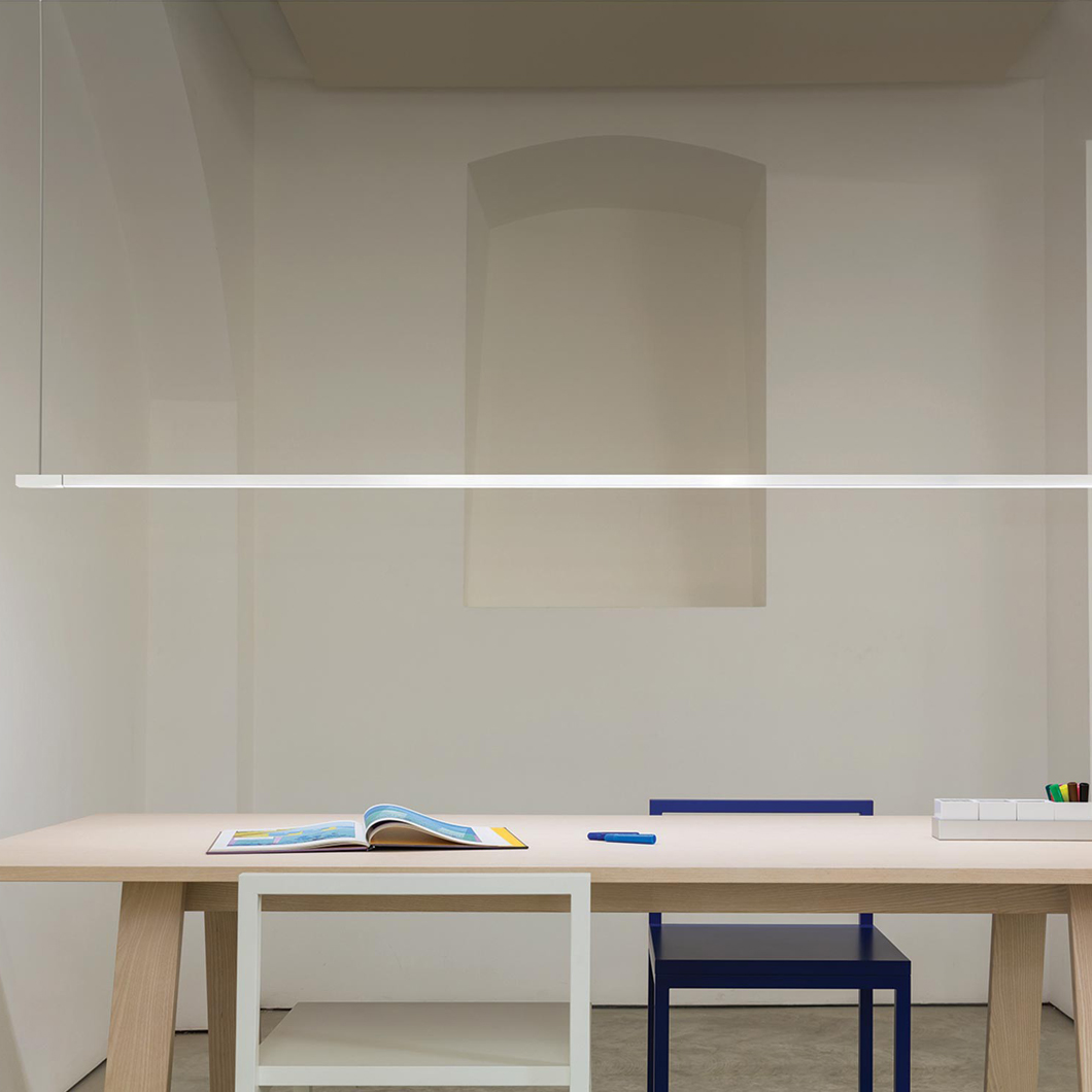 The Nemo Linescapes Horizontal pendant is part of a family of floor, ceiling and wall elements, efficient with an highly versatile linear luminous output. Body in aluminium extruded and opal white polycarbonate diffuser, junctions and fixing components in die-casted aluminum and steel. White finishing with elements painted in grey.