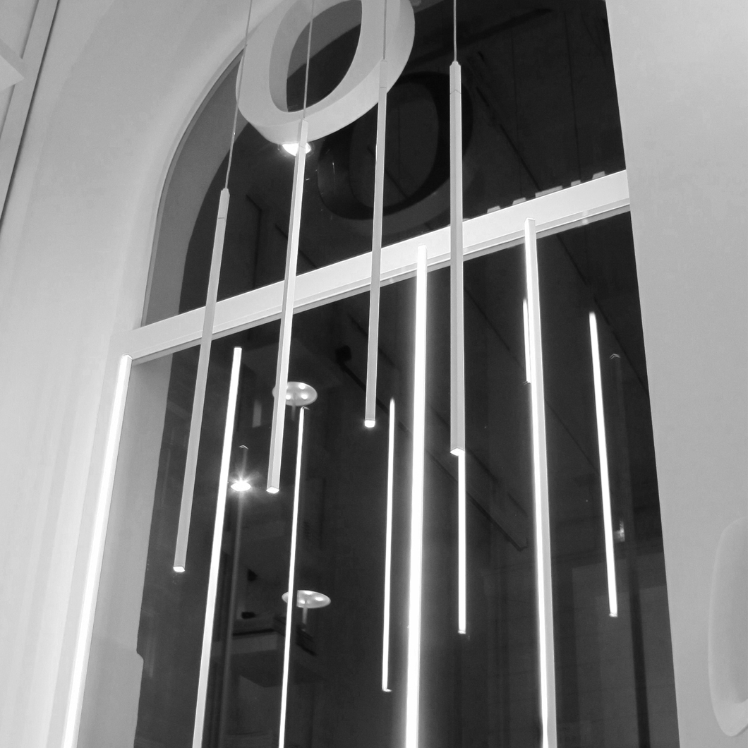 The Nemo Linescapes Vertical pendant is part of a family of floor, ceiling and wall elements, efficient with an highly versatile linear luminous output. Body in aluminium extruded and opal white polycarbonate diffuser, junctions and fixing components in die-casted aluminum and steel. White finishing with elements painted in grey. A separate recessed version is available, please contact us for details.