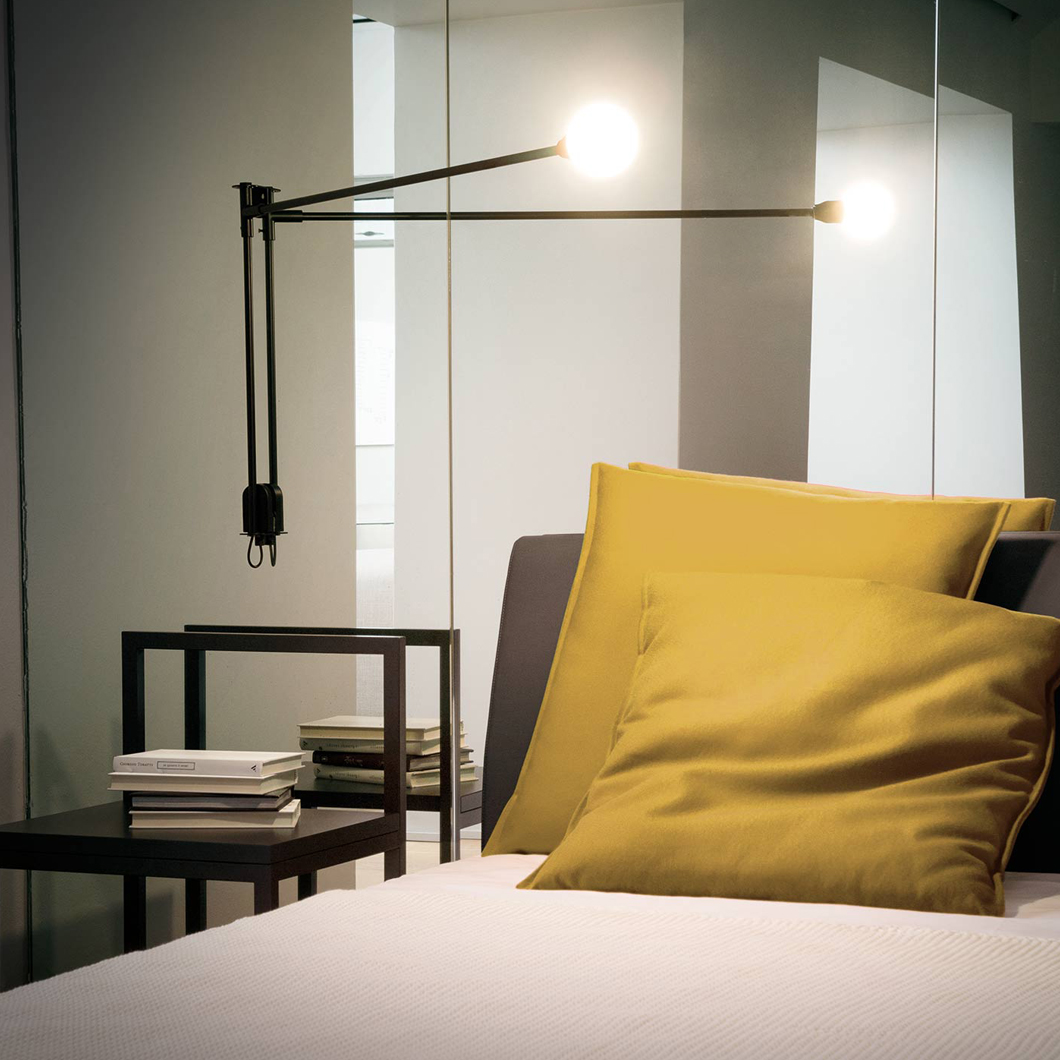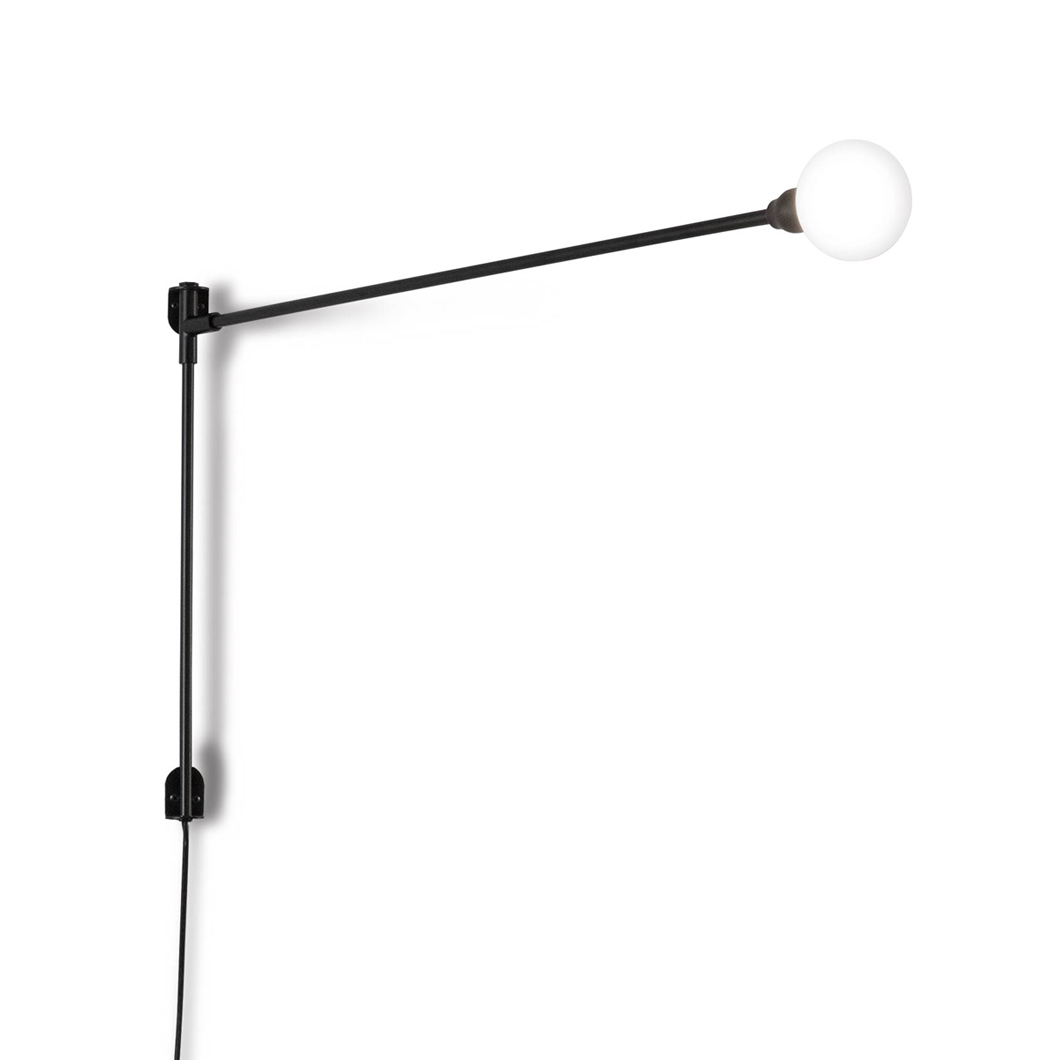 Crafted from aluminium, Potence Pivotante Mini is a slim, tubular wall light with its structure reminiscent of a sailboat bloom. Available in a matte black finish, the Mini version retains the same design as its larger sibling, just in a more compact size ideal for smaller rooms and interior spaces. Potence Pivotante is a versatile wall light, as its arm allows for 180° horizontal rotation, allowing light to be directed and focused on specific areas in a space. This wall light comes complete with power cord, plug and dimmer. Lamp not included.