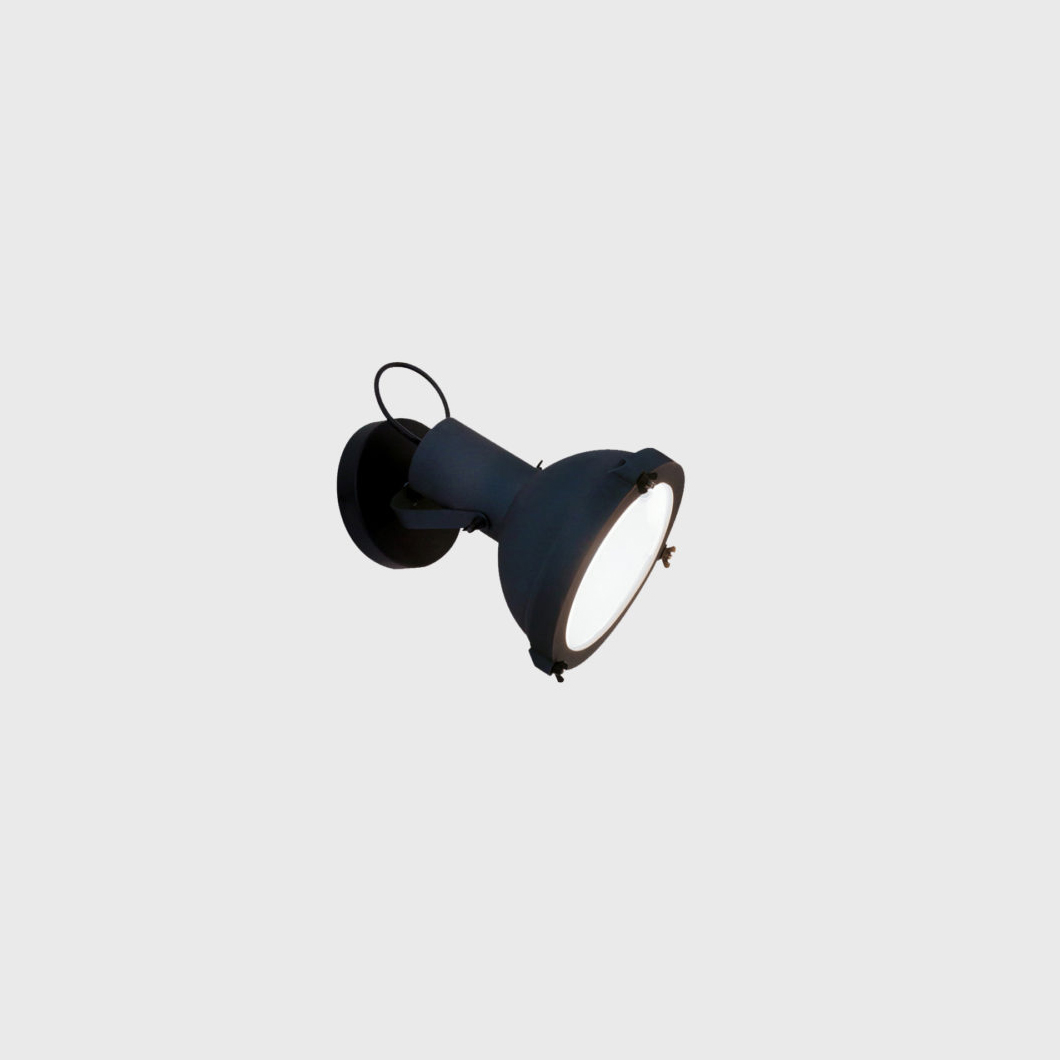 The Nemo Projecteur 165 wall or ceiling light is a mini adjustable version of the Projecteur 365. Aluminium body painted in night blue, white sand or moka. Diffuser glass curved and sandblasted in the inner part. Clamp and canopies painted in matt black, screws and small metal parts black chromed. Diffused and adjustable light output. E27 socket allows the use of fluorescent, LED and halogen sources. Lamp not included.