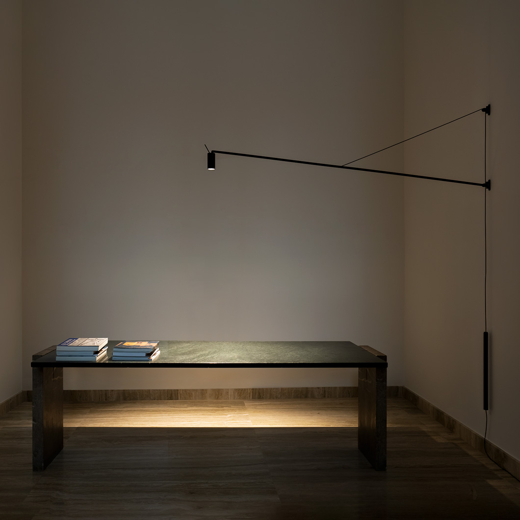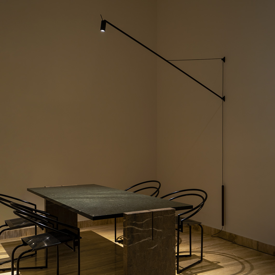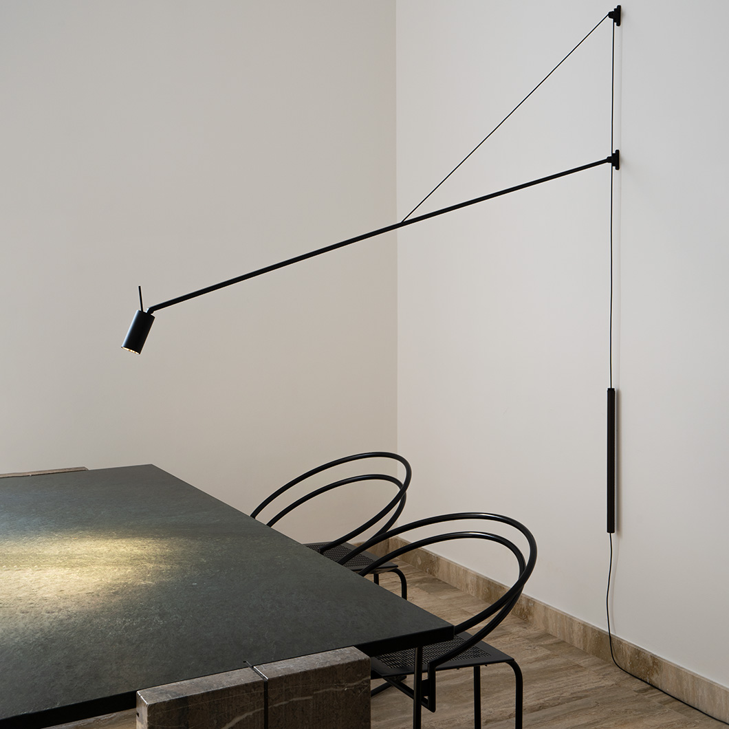 Minimalist in style, Swan is designed to offer a direct light from a wall light mounting, perfect for illuminating a table or desk. Structure in matt black painted aluminium. The arm is adjustable horizontally by 180° and vertically by 40°. The counterbalance is finished in luxurious leather. The cylindric head is adjustable, allowing the light beam to be directed for task lighting. Optional honeycomb filter for antiglare included. Dimmer on cable.