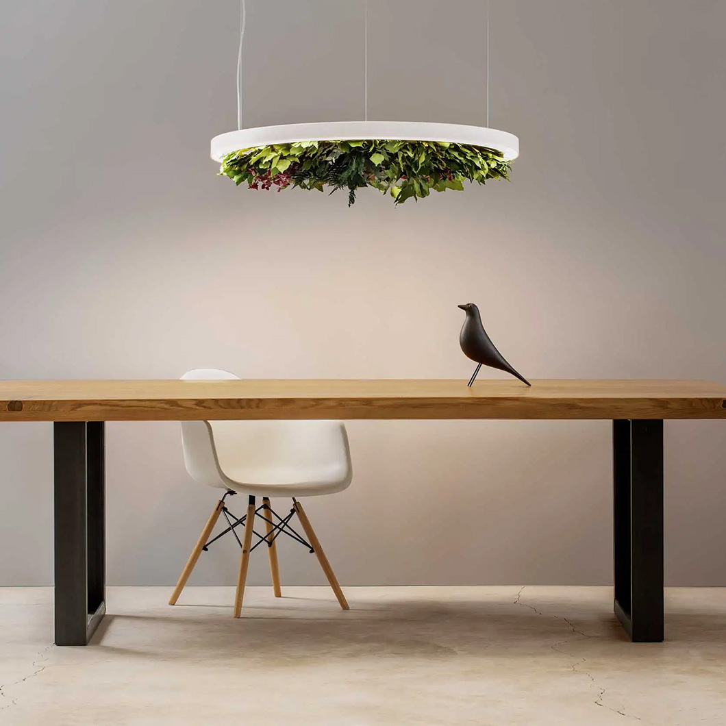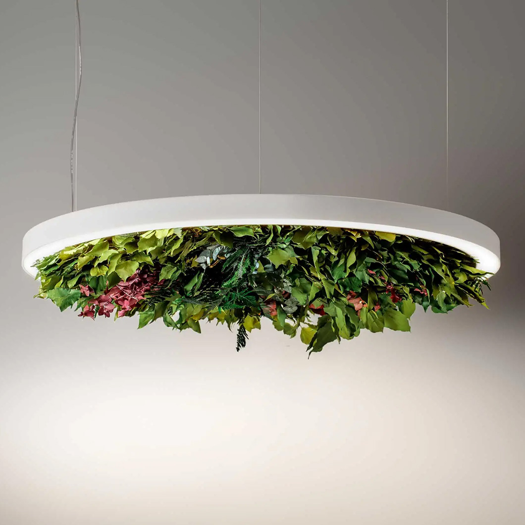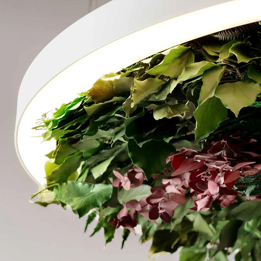The Gavin suspension light offers a leaf composition as an optional accessory made up of ivy, fern, and eucalyptus leaves. This leaf kit is housed within porous and sound-absorbing materials, helping to reduce the propagation of sound waves. Thanks to a stabilisation treatment, the foliage accessory will not change over time, grow, or require any maintenance.