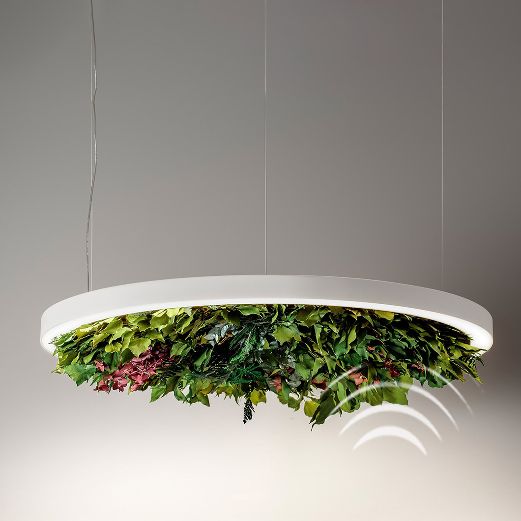 Gavin Silence Leaf by OLEV is a ring pendant with a sound-absorbing panel and real stabilised leaves. The contemporary drop light responds to the emerging trend of biophilic, natural design by incorporating plants into the pendant's structure. The light is designed with visual comfort in mind, offering adjustability in intensity at any time. Gavin is available in Ø500mm, Ø700mm and Ø1000mm sizes.