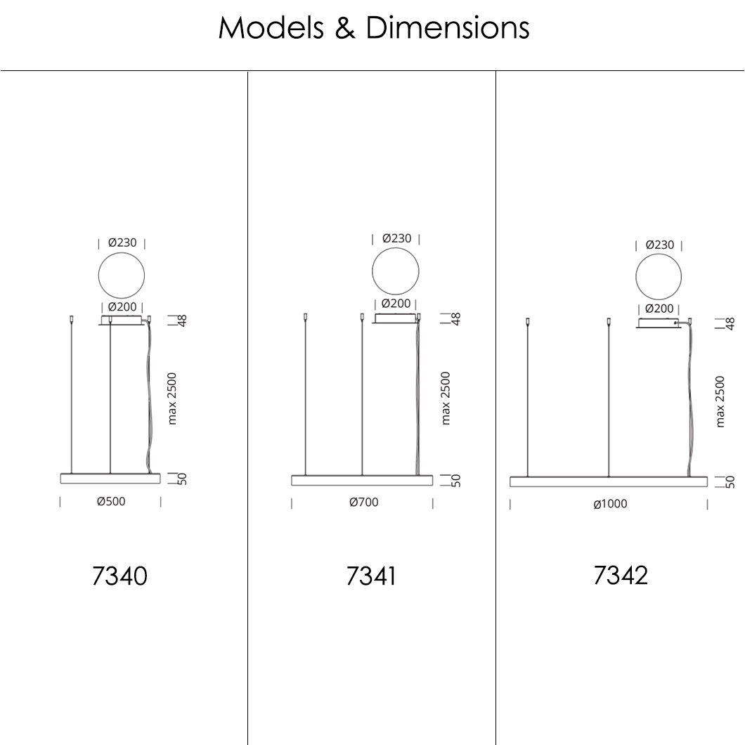 The circular pendant and accompanying canopy are available in white or black finishes. Please contact us for more information on other finishes. 3000K LED included. Each model is dimmable via PUSH, DALI, and 1-10V.