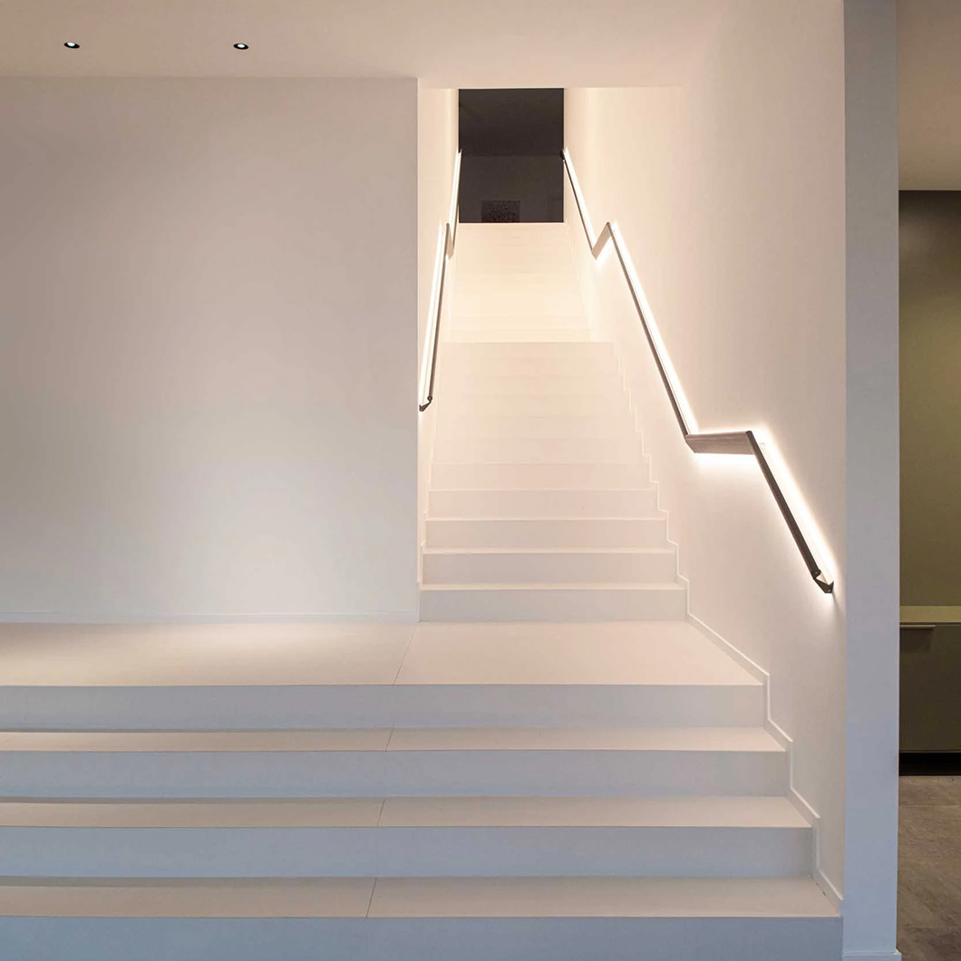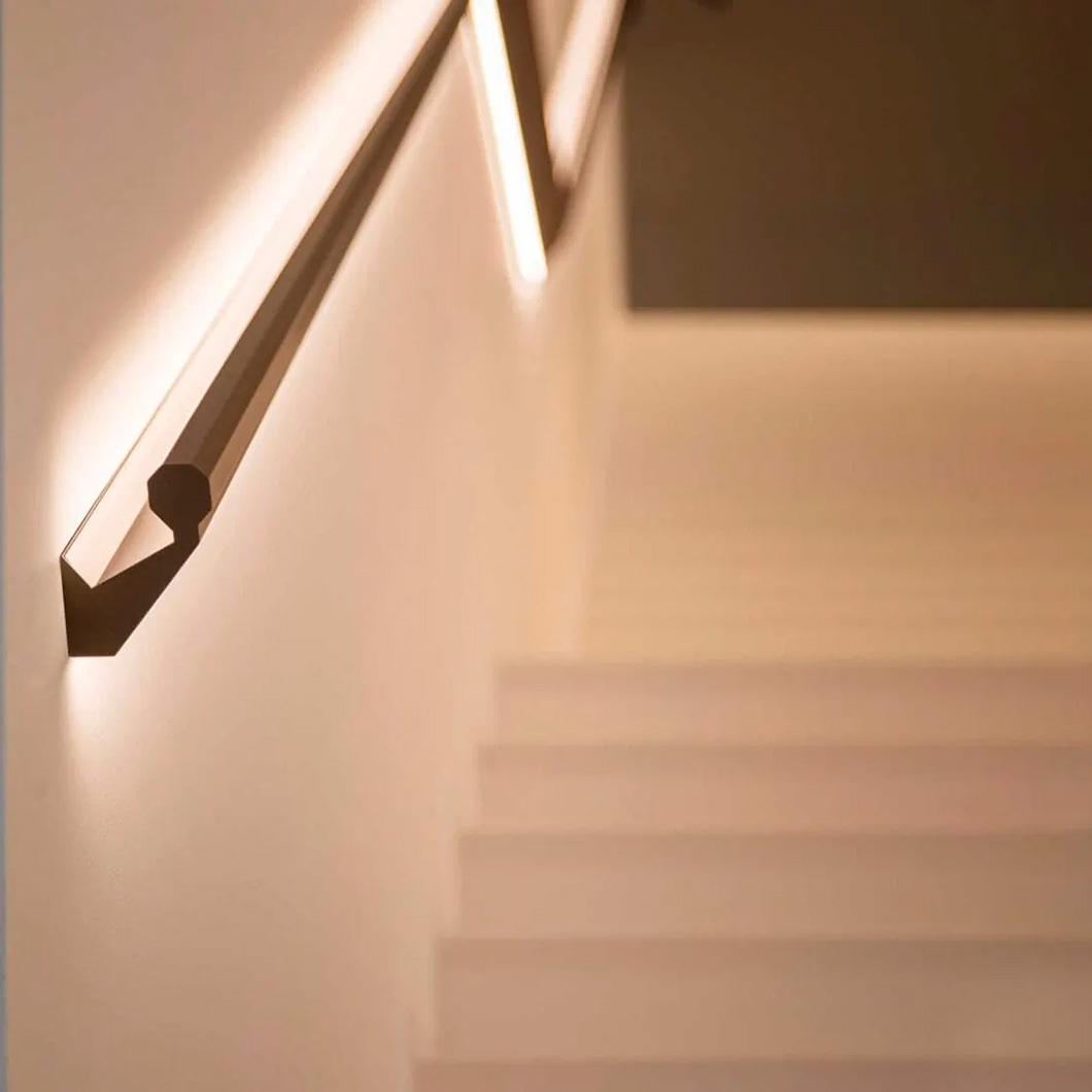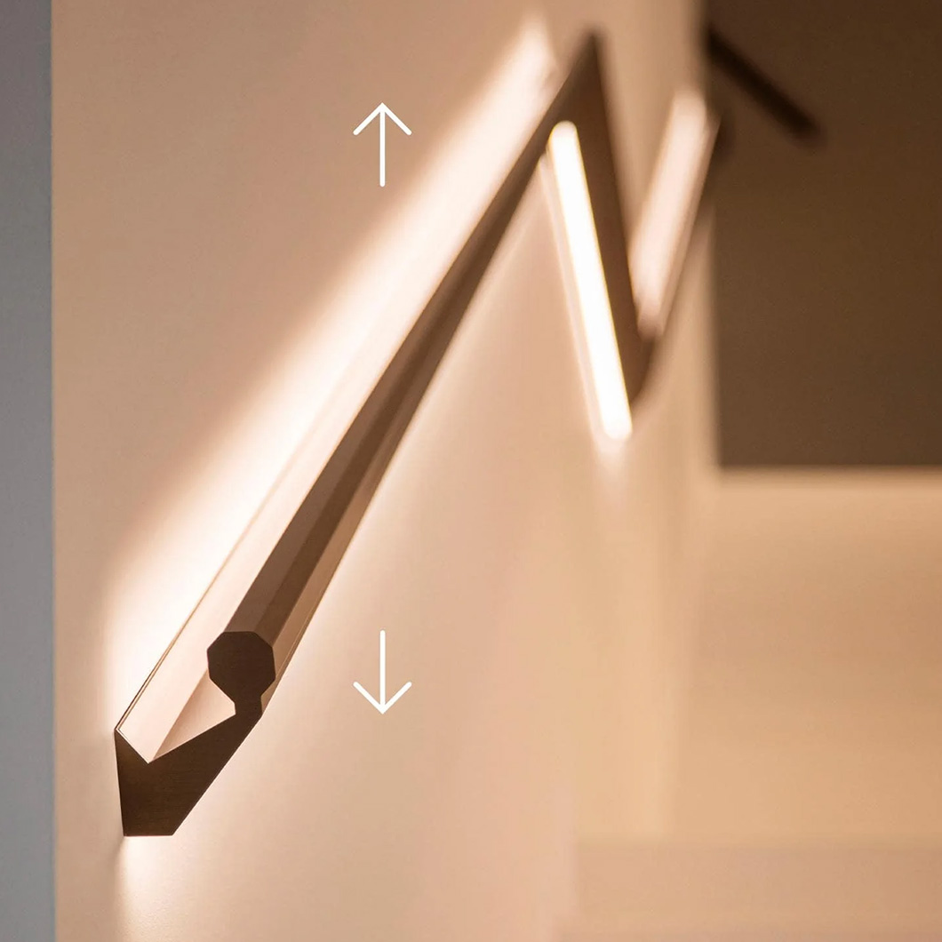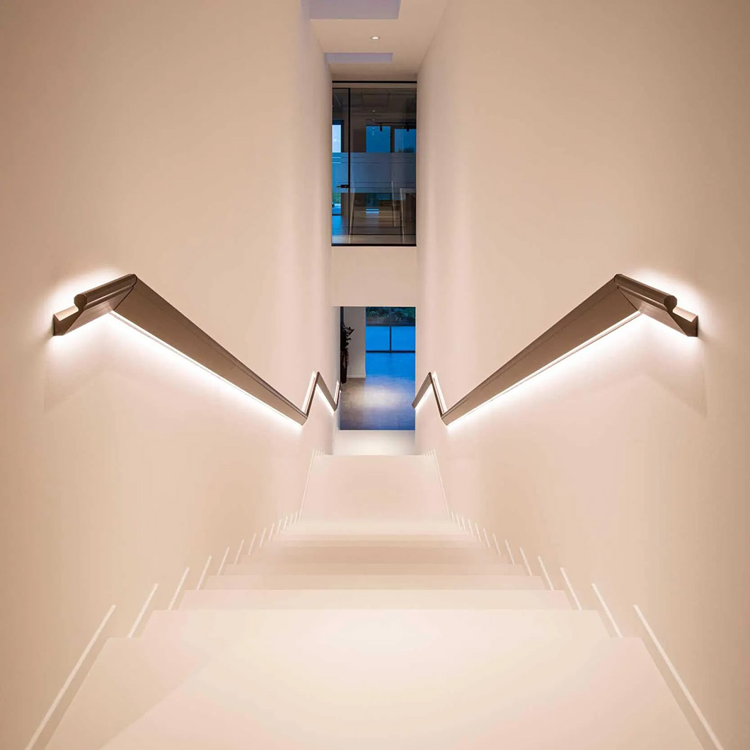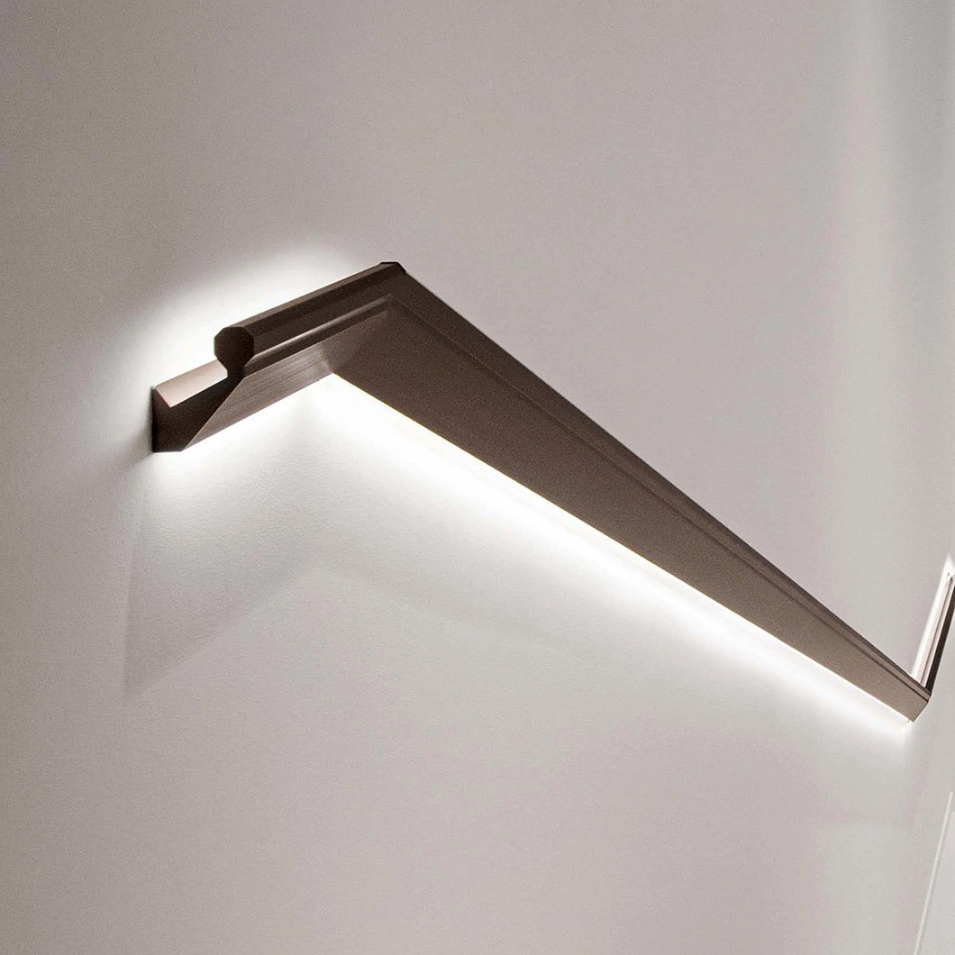 Ottomano by OLEV is a wall-mounted handrail with integrated LED lighting. The handrail is equipped with a double light source, available in 2700K, 3000K, or 4000K colour temperatures. The unique luminaire features a light source placed underneath the fixture for safe step lighting, as well as an internal light source that provides the whole stairway with glare-free illumination.