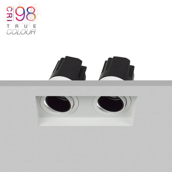 The DLD Andes Mini twin has a double anti-glare design, with a black baffle and a plaster frame with high depth. With an optic of 6cm in diameter, the Andes Mini is ideal as a directional downlight for bathroom zone 2 (it's also suitable for standard rooms) thanks to the IP54 rating. The 24º adjustable tilt and 355º rotation mean Andes can be used to highlight specific walls or architectural features. As part of our True Colour range, this downlight has a CRI98 integral LED chip, rendering colours around your home at the highest quality.