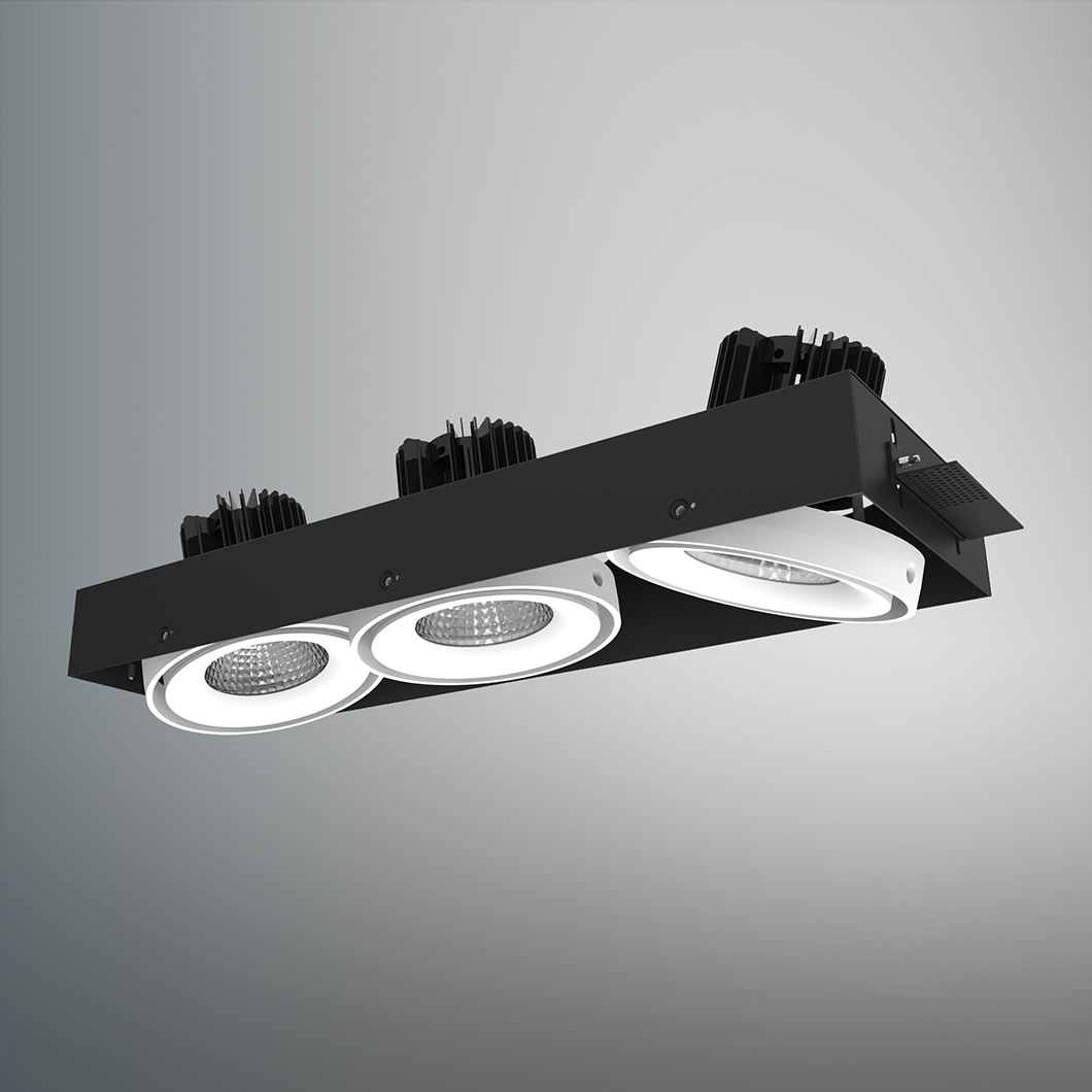 Fuji LED triple adjustable recessed plaster in downlight with a lumen output of around 3x 1500lm - making it perfect for installation in residential projects. Coupled with 30º adjustability, this creates a truey flexible fitting. Die-cast aluminium luminaire with steel housing. Heat sink in forged aluminium for optimum heat dissapation. Reflector in PC plastic. Finished in white and black. Reflector available in 40°.