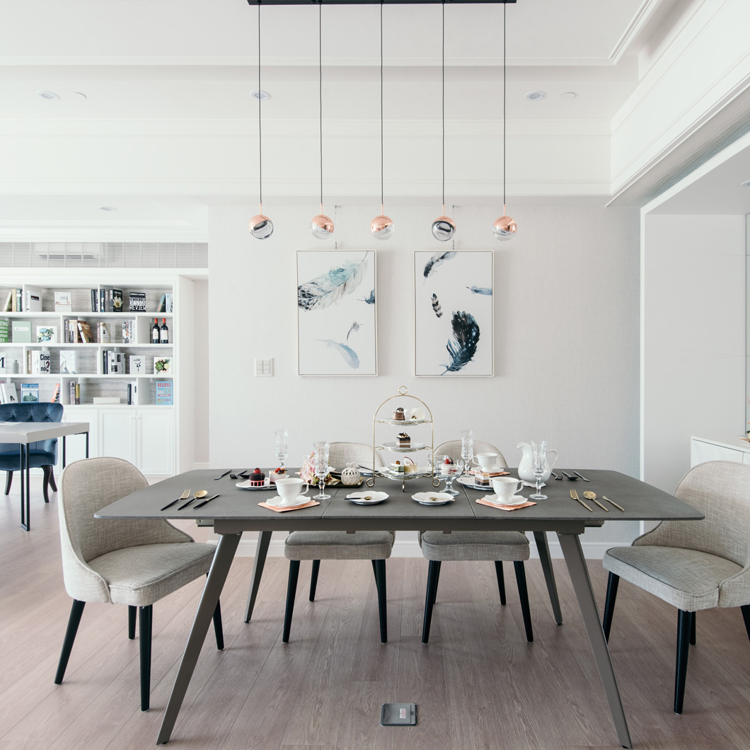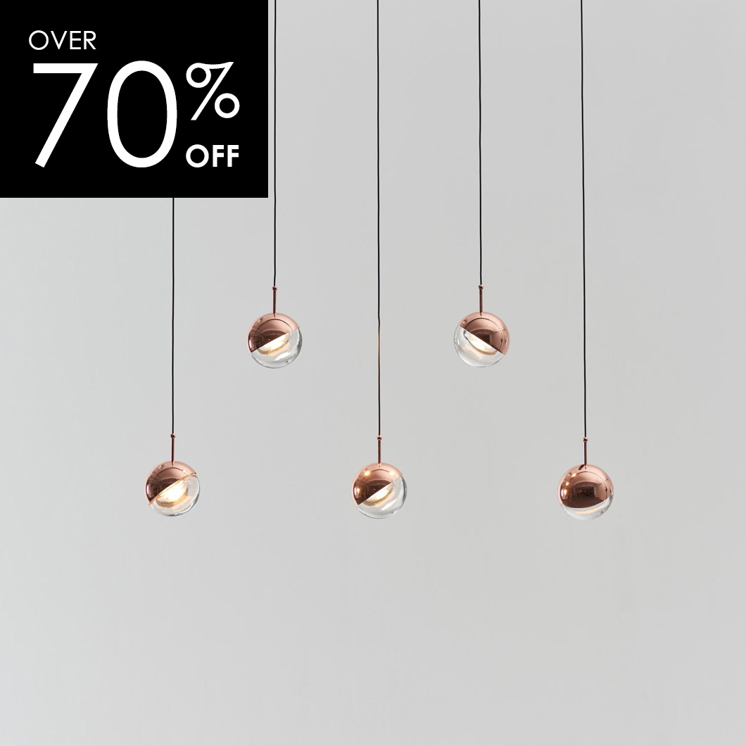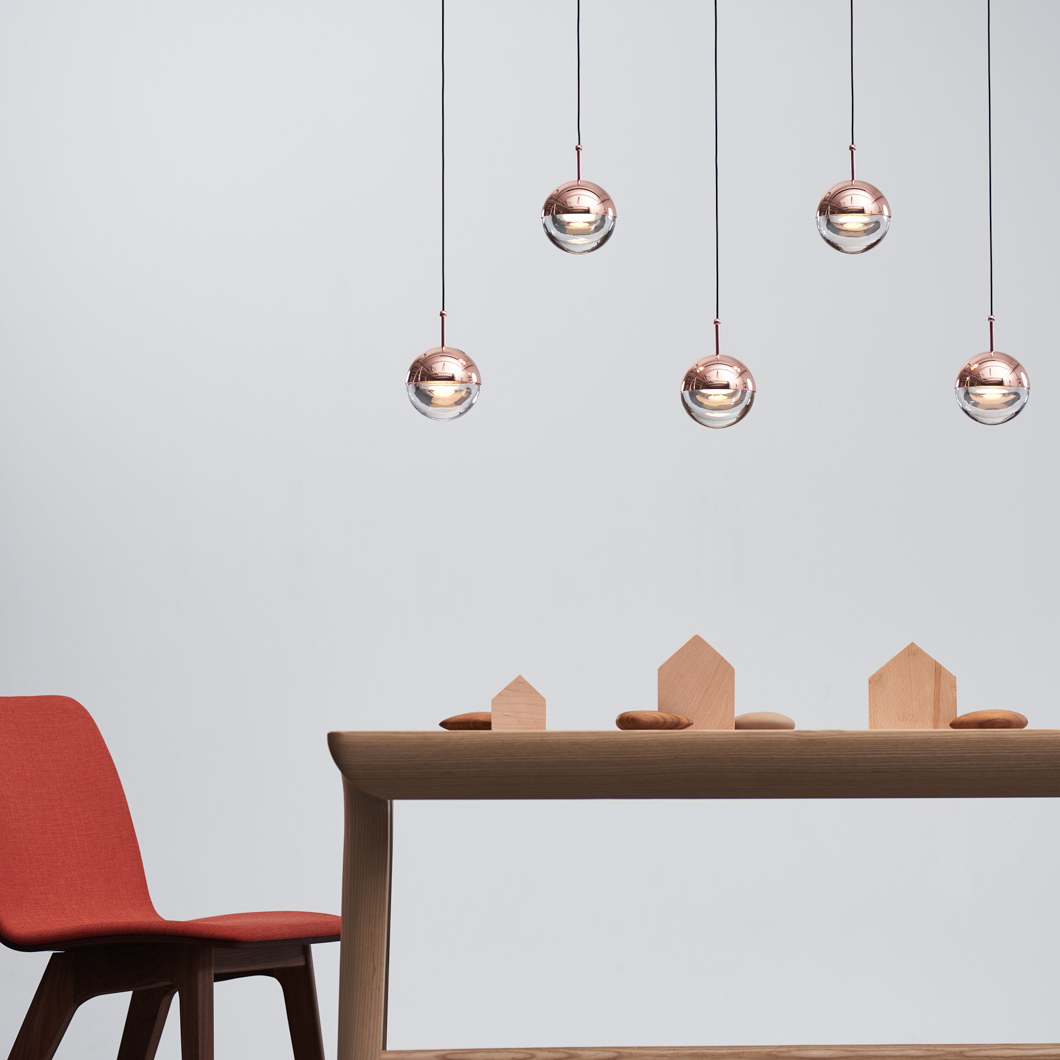 The Seed Design Dora PL5 Pendant is a linear row 5 drop suspension variant of the Dora family. With a black ceiling rose bar, the shades are all evenly spaced in a line which is perfect for hanging above ceiling islands or dining tables. Interact with Dora as if you are a child again, the shades can be rotated up to 35 degrees, changing the direction of light. Each cable has a maximum drop of 200cm giving you the freedom to shorten each to any length, whether you want a uniform row or random formation, there’s versatility to the way your pendant is showcased. The stylish chic globe diffusers consist of a contemporary copper side and glass side which projects the cutting edge warm white integral LED light, creating a cosy inviting atmosphere in your home. Complete with a built-in dimmable driver.