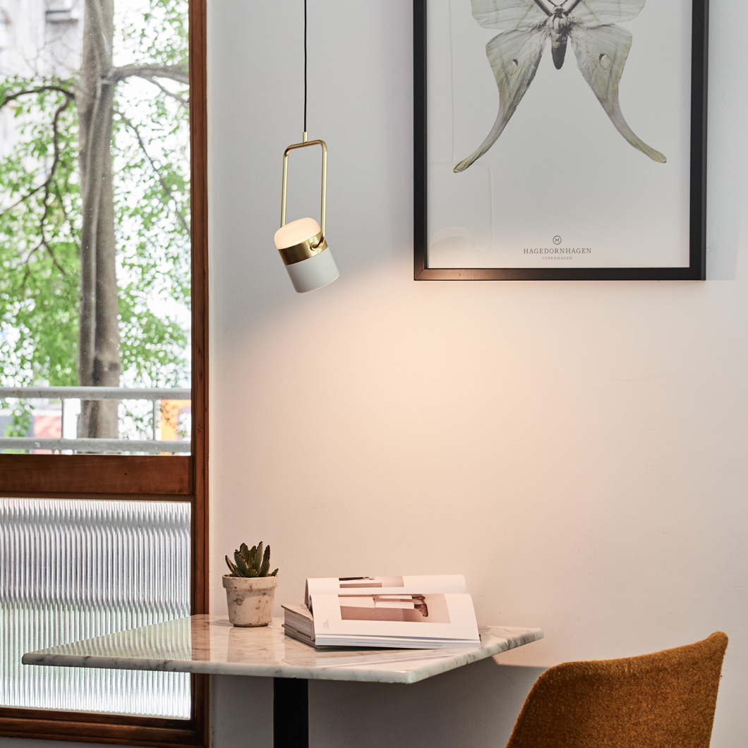 The Seed Design Ling P1 V LED Brass Pendant is inspired by early metal fences in Taiwan surrounding balconies and windows. The brass structure is reminiscent of art deco design through the geometric shape. The shade, constructed from frosted glass and steel, can be adjusted through a left and right tilt for you to position the beam of light wherever desired. In a white and brass finish which uses the great contrast on a sophisticated matt white with the warm glow that the stylish brass emits. In our professional opinion, Ling would look best as an individual or pair in a bedroom or kitchen area highlighting a particular spot of interest. LED lamp included.