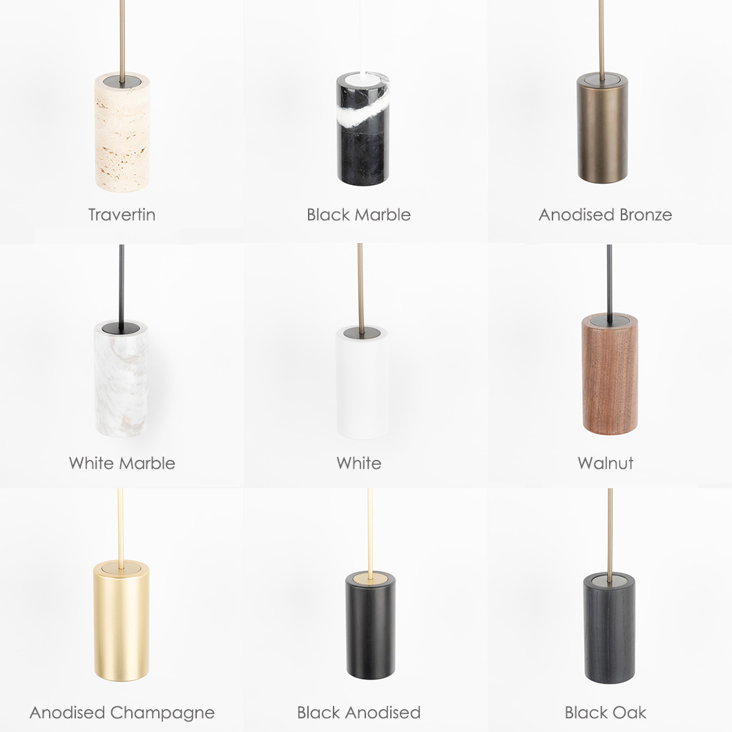 Finishes: combinations of white, anodised black, anodised champagne, and anodised bronze