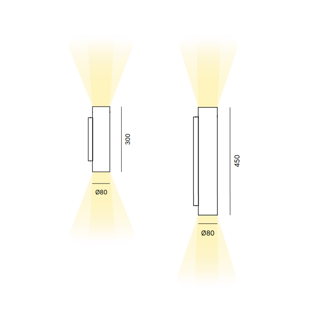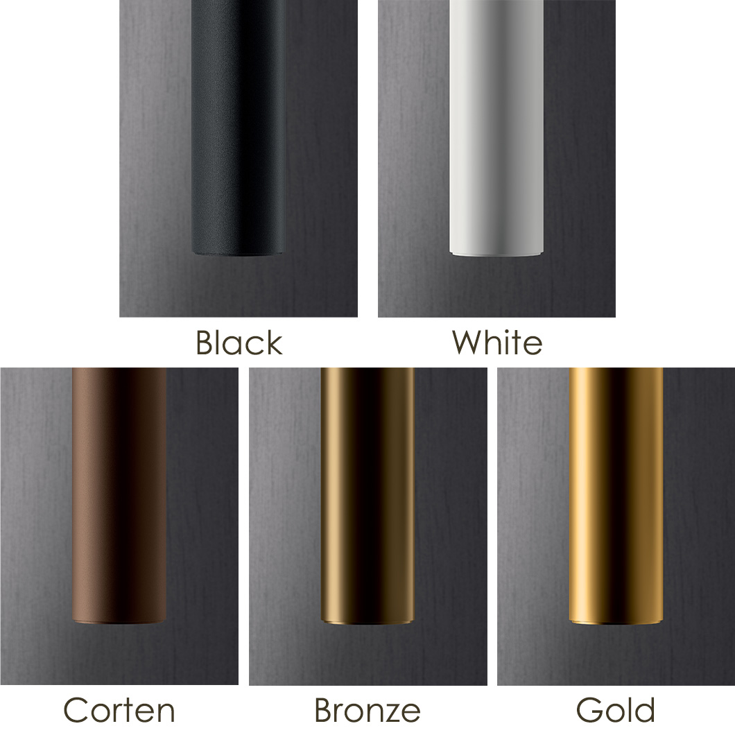 Tube's aluminium body has a powder-coated finish to achieve your desired aesthetic. Choose between a classic black or white, a natural corten, or an elegant bronze or gold. Available in two lengths, with a single diameter of 80mm, choose between 300mm or 450mm. Tube can be installed independently or in unique compositions which stagger the two sizes.