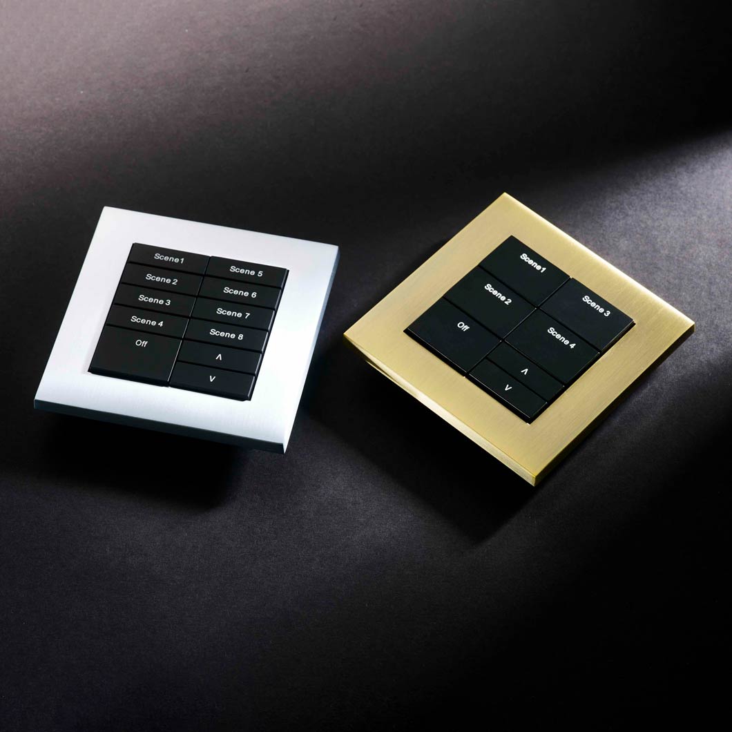 The Rako RK-MOD wireless push button wall plate with up to 12 push buttons. Customisable and programmable via NFC communication