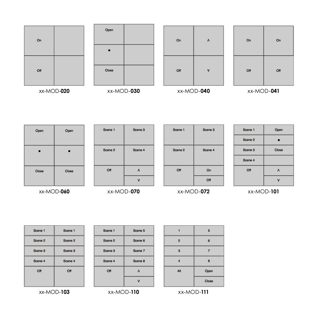 The RK-MOD-xxx-x uses three different button sizes across a range of keypad layouts. This offers a truly flexible range of designs to suit all your lighting control requirements including: Curtain, Blind, Audio, Multi and Single Room layouts.