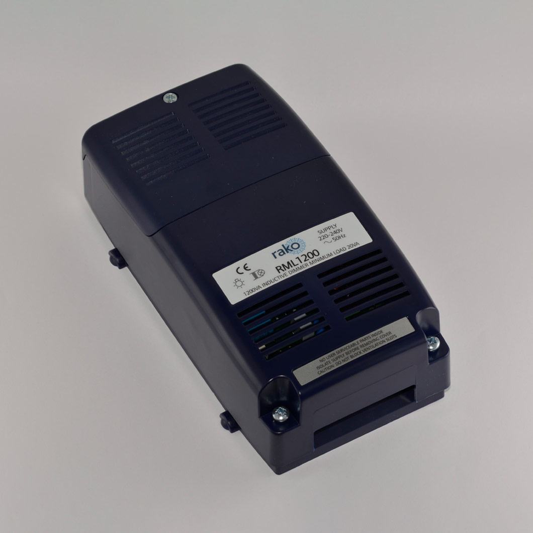 Designed to fit in a ceiling void using an access panel or an electrical cupboard, the RML1200 inductive dimmer can control up to 1200 watts of mains dimmable lighting loads. The unit can also be used for exterior lighting control applications, with the use of a weatherproof IP rated enclosure. With protection features such as field replaceable fuse, overtemperature and voltage surge protection. Programmed using either an RCP/RCM RF wallplate or the RASOFT PC software suite, the unit stores the House, Room and Channel address plus 16 preset scene levels in non volatile memory. The RML1200 dimmer can be controlled from any Rako transmitter such as RCM/RCP wallplates, RAH hand helds, Bridge modules and forms the foundation of any Rako scene-set system.