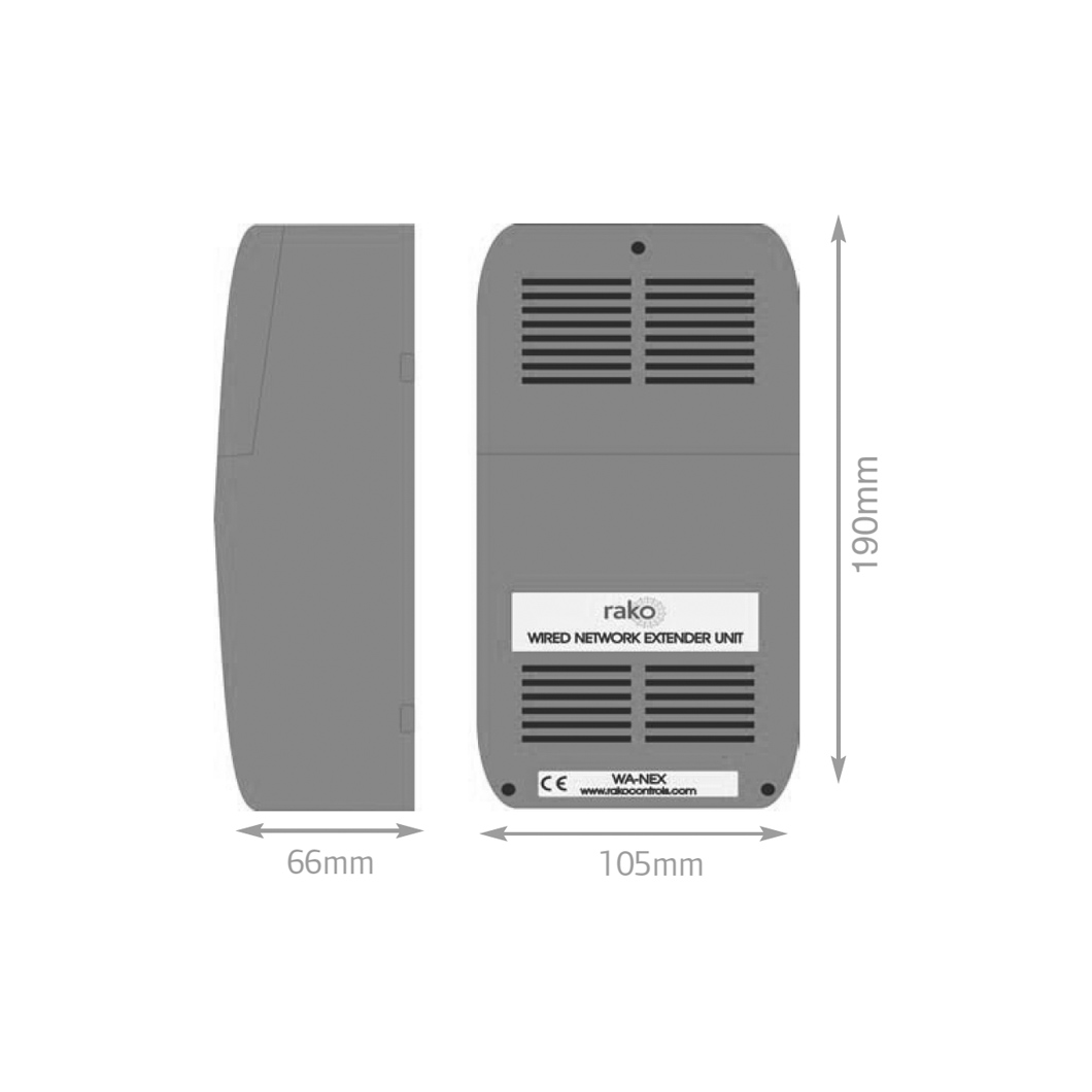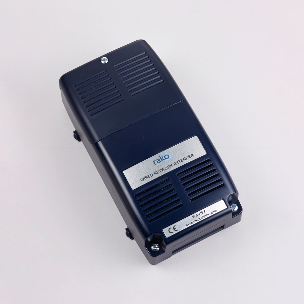 The Rako WANEX is a network extender for large Rakom networks, creating two linked Rakom networks. Can be used when the maximum data cable length of 3km is exceeded (more common when using RAK-STAR units).