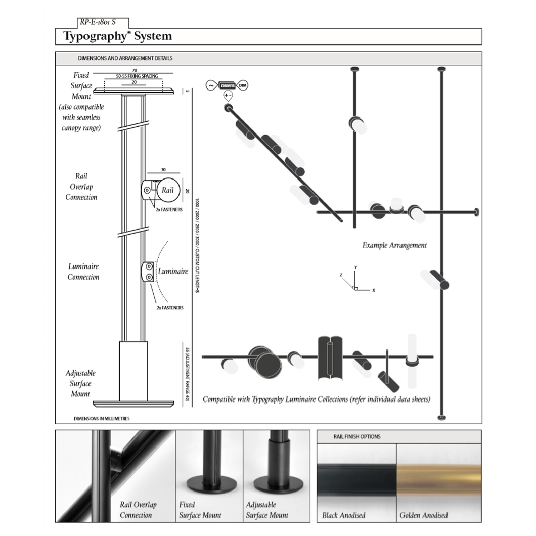 The Rakumba Typography Rail is a linear lighting system which shows off Rakumba’s technical abilities and talent of the designers involved. High quality manufacturing is used within the sleek, slimline linear structure. As it’s a modular system, you can purchase the modules separately to build your own composition, whether you want a small rail with a couple of lights on or a large configuration with multiple lengths of rails combined projecting in different directions. Available in anodised black or gold.