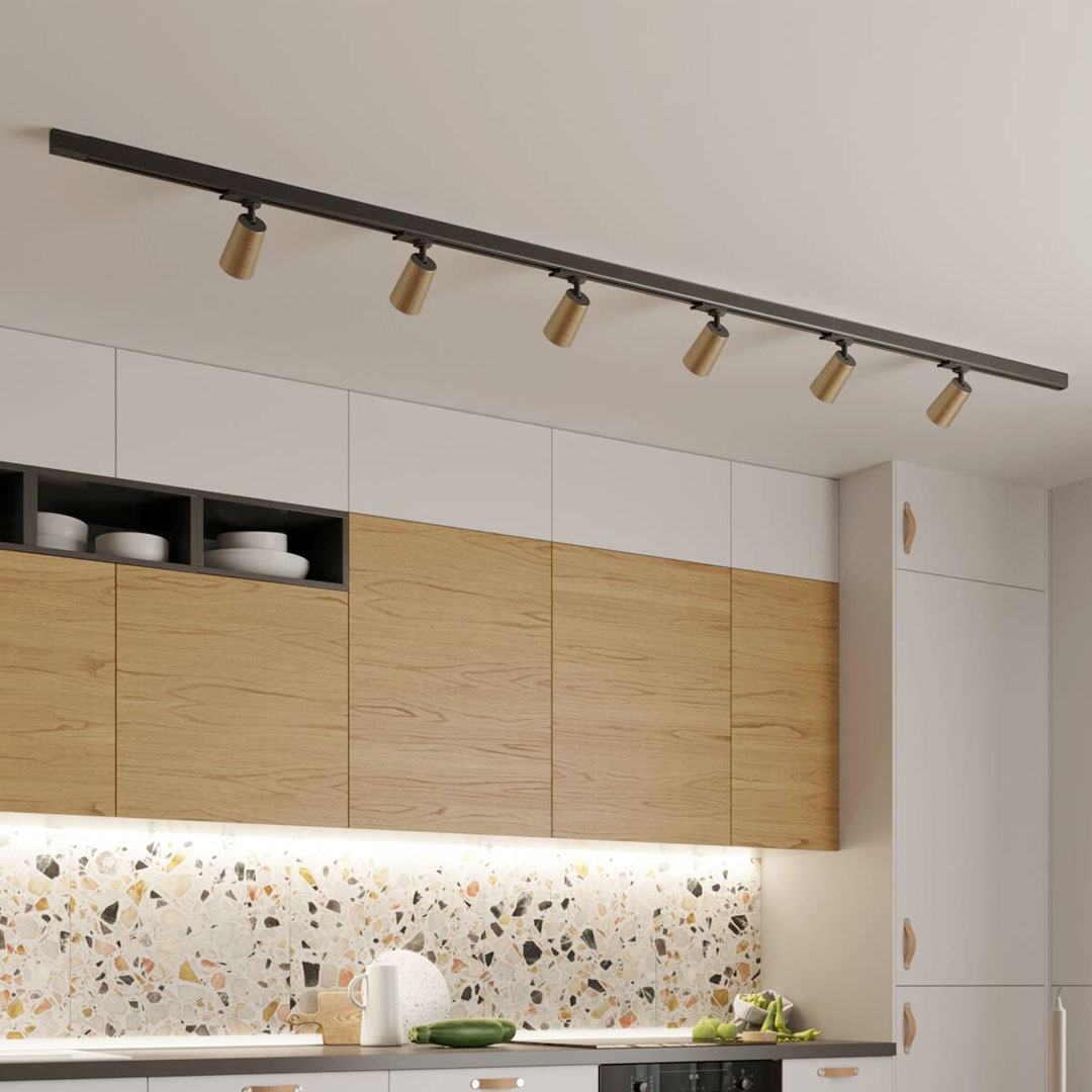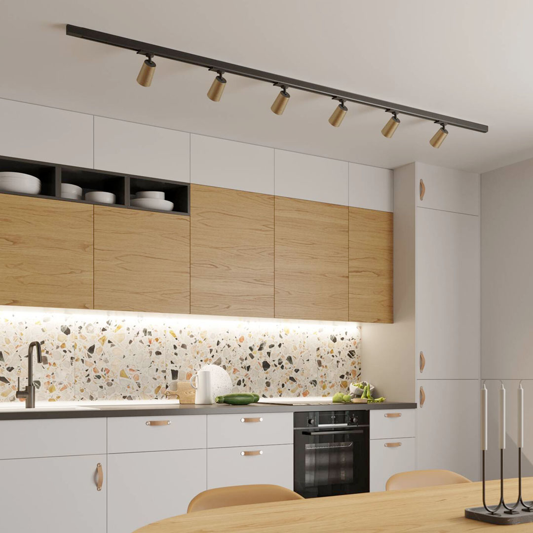 A preset combination ideal for a kitchen or long work surface, the modern Raw Design Lumi surface mounted track with Aura spotlights package comes complete with everything that you need.