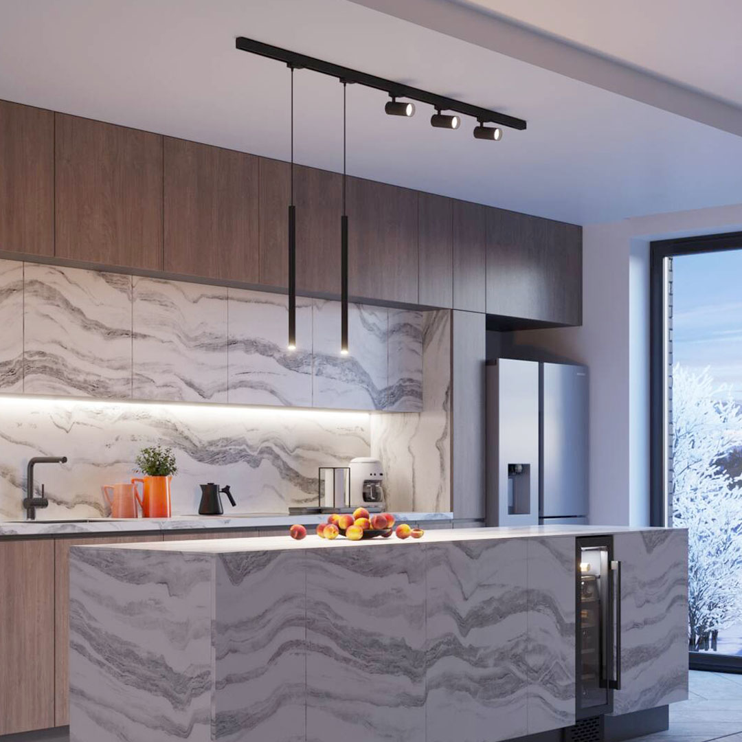 A pre-designed surface mounted track package for kitchen islands or a long work surface, the modern Raw Design Lumi track comes complete with 3 Isa LED spotlights, 2 Pastelo pendants and everything that you need.