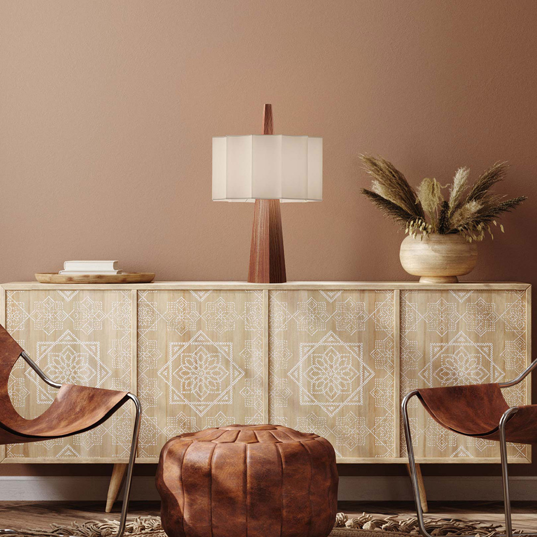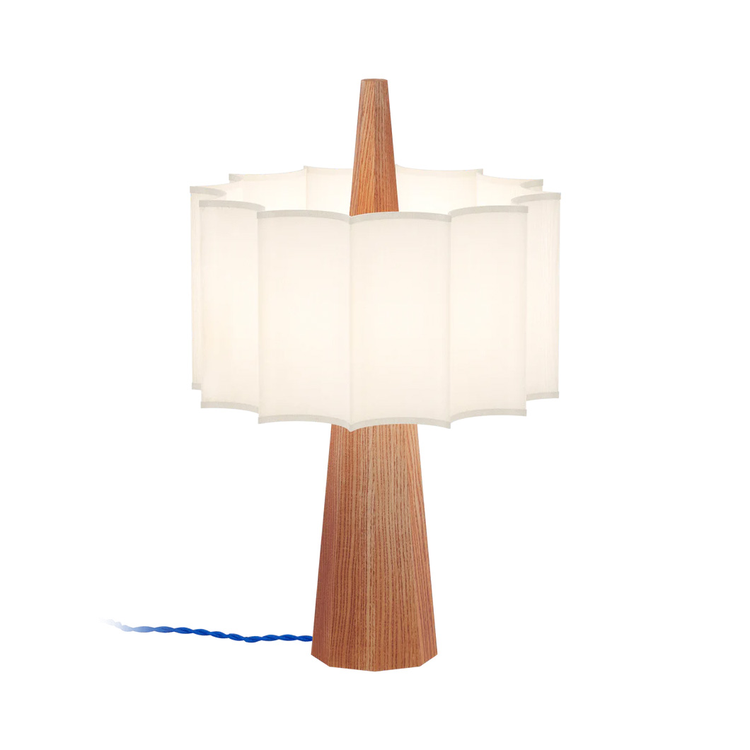 A seamless blend of natural material and geometric design, the Rain Table Lamp by Robin shows off a modern look that complements a range of spaces. Rain's hexagonal pyramid base is crafted from sustainable chestnut wood sourced from FSC-certified forests. The natural structure is complemented by a white fabric shade, enhancing the warmth of the lamp.