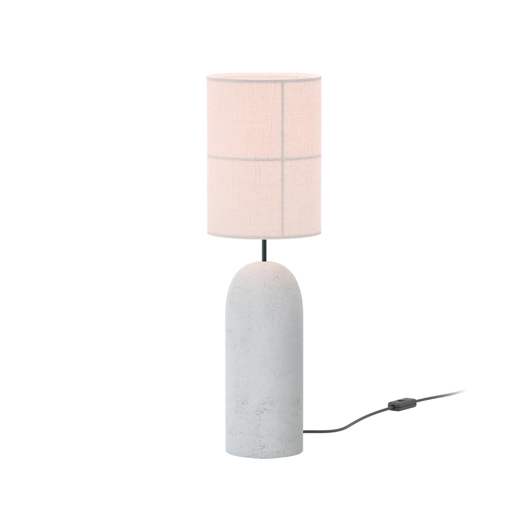 The minimalist elements of the lamp make for an elegant look that complements a modern interior. The chic concrete base is available in a light grey or dark grey finish, matching a variety of contemporary styles. The cylindrical lampshade reveals a delicate, lined pattern when lit, capturing a sophisticated essence.