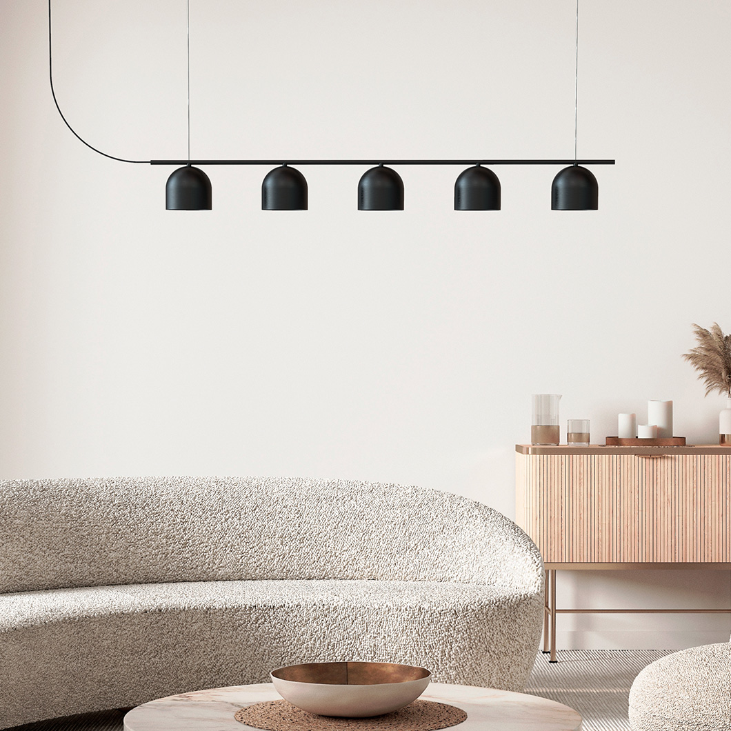 Rio is available as a chandelier with either 3 or 5 lampshades: the 3-shade model has a width of 900mm, while the 5-shade model measures 1200mm in width. Rio can be adapted to suit your décor with three available finishes. For a classic, modern look choose the matt black option, or select the matt white for an elegantly minimalist aesthetic. Alternatively, make a statement with the striking matt terracotta red finish.