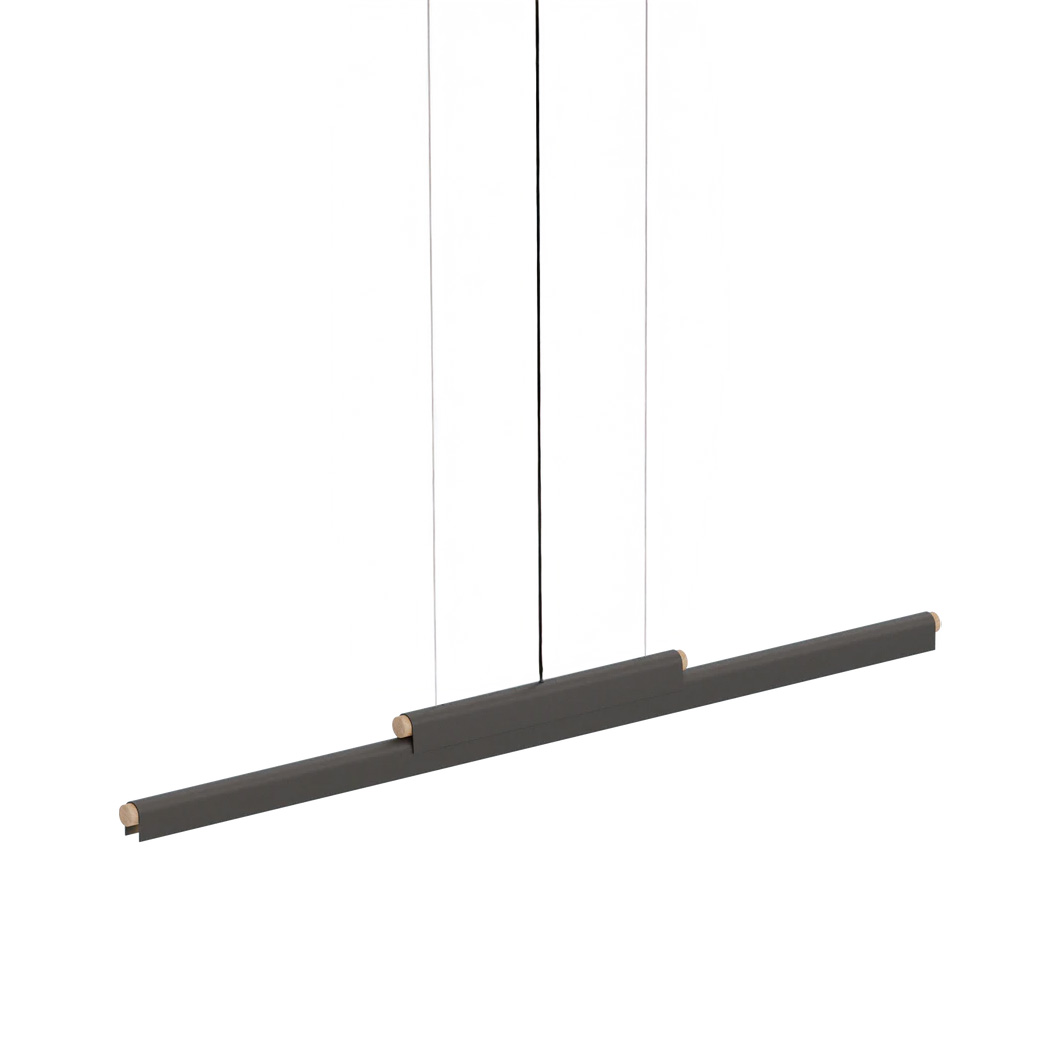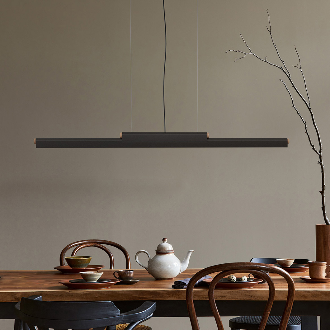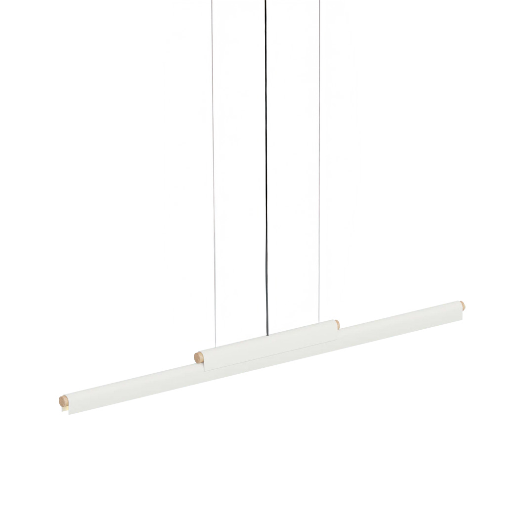 The Rudi Linear Pendant by Robin exhibits a modern look with its minimalist form and stylish colour palette. Rudi's elongated iron structure can be finished in matt black or matt white, with natural wood caps to complement the sleek design. The suspension light's understated appearance makes it an elegant feature in a contemporary home or commercial setting.