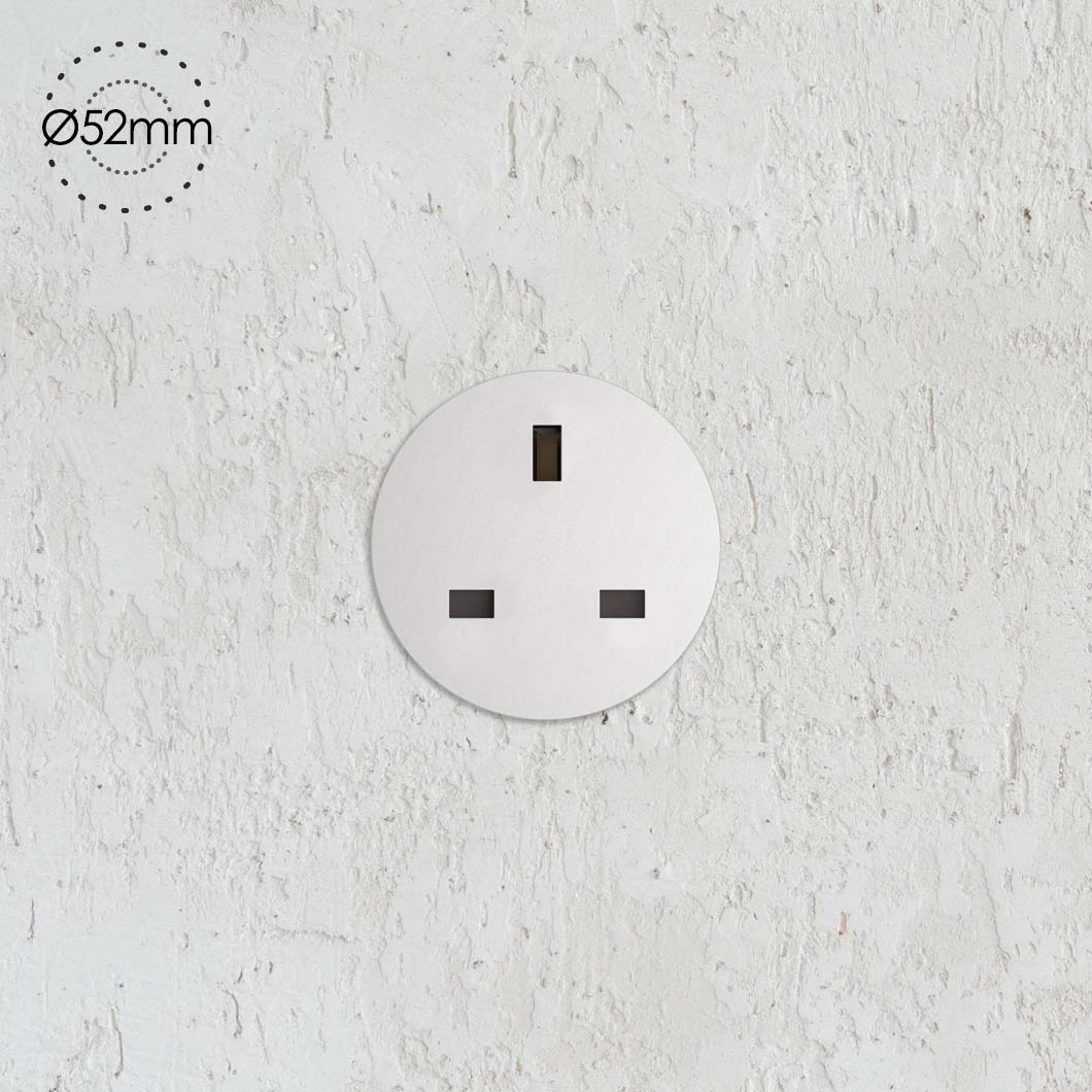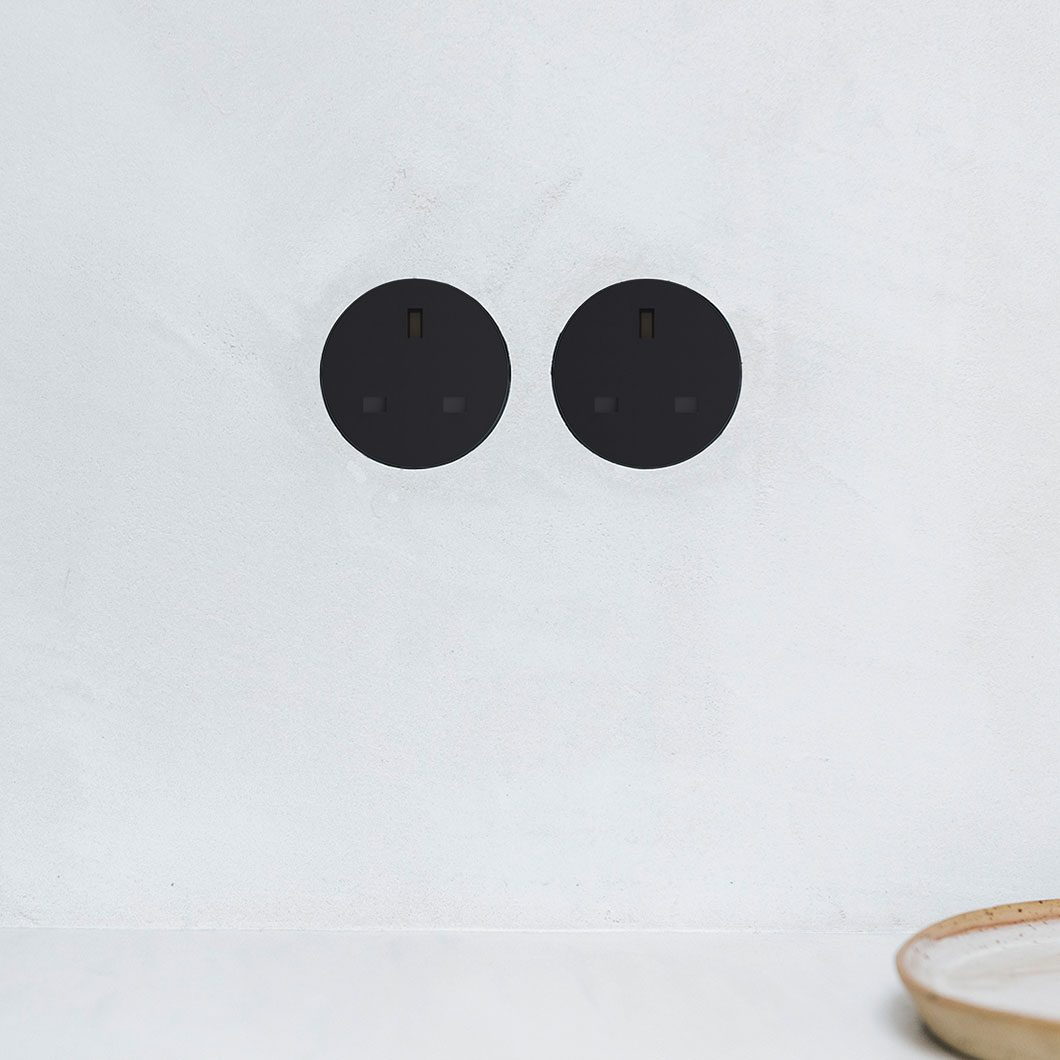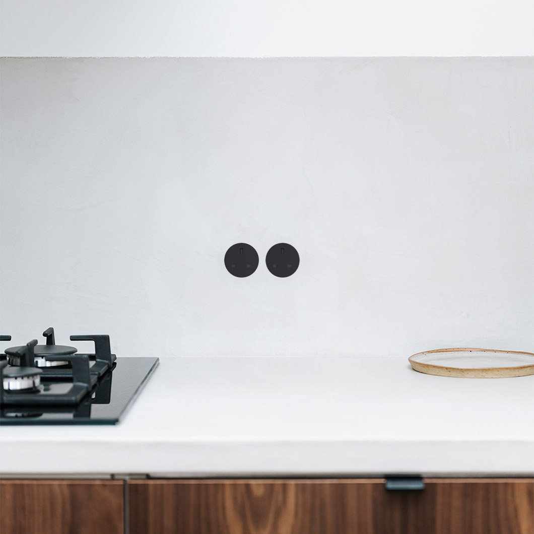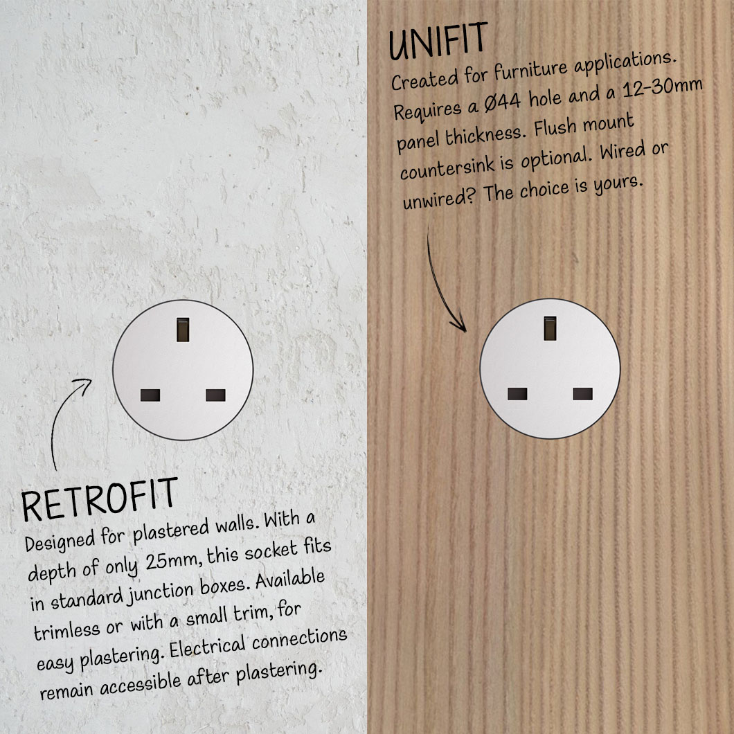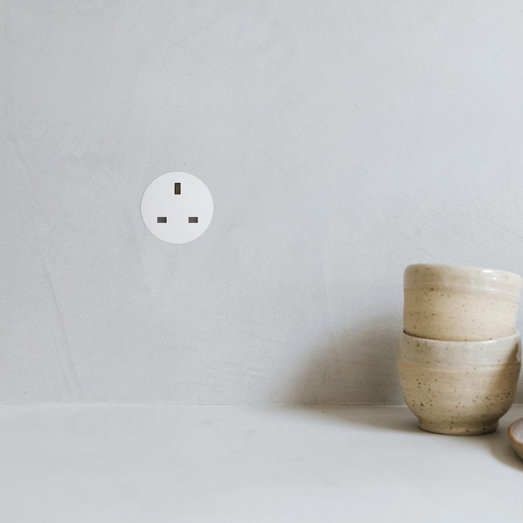 The minimalist socket. One module, endless possibilities. The Retrofit UK round socket by rond is specifically designed to be plastered into walls for a contemporary and minimal finish. Available in white, black and cream. The small trim version sits just proud of the wall, covering the installation ring.
