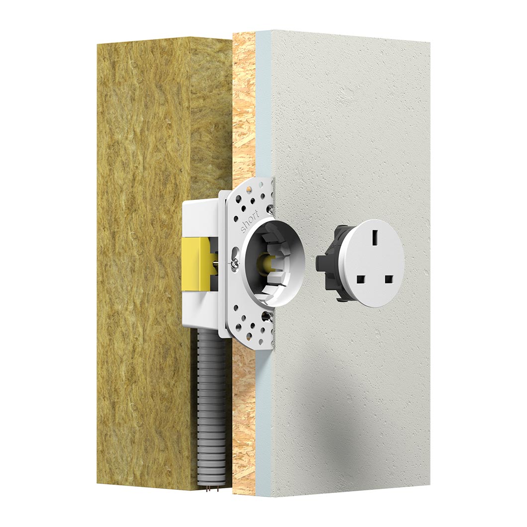 Cross Section of Rond Retrofit Small Trim UK switchless power socket installed into plasterboard wall